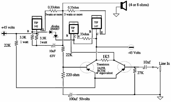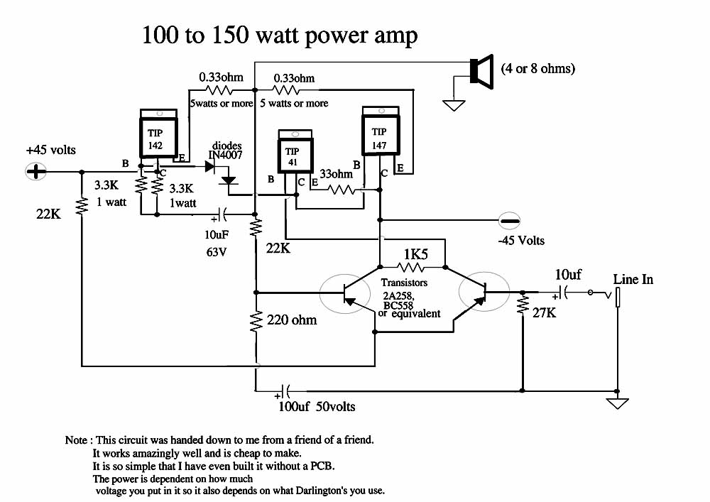Szeretnék építeni egy darlington tranyós erősítőt ami 100w-ot lead 8 ohmon. Néztem hozzá egy kapcsolást de sokak szerint nem jól lett kitalálva az egész .A véleményetekre lennék kíváncsi ezzel kapcsolatban mit lehetne összehozni ? Vagy esetleg aki ezt megépítette hogy rakta össze mit módosított a kapcsoláson vagy ha valakinek van 100-150w os tranzisztoros kapcsolása ami szerinte jó azt ha megkérhetem küldjön rajzot.
