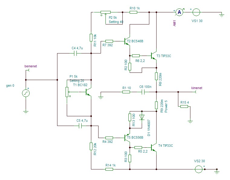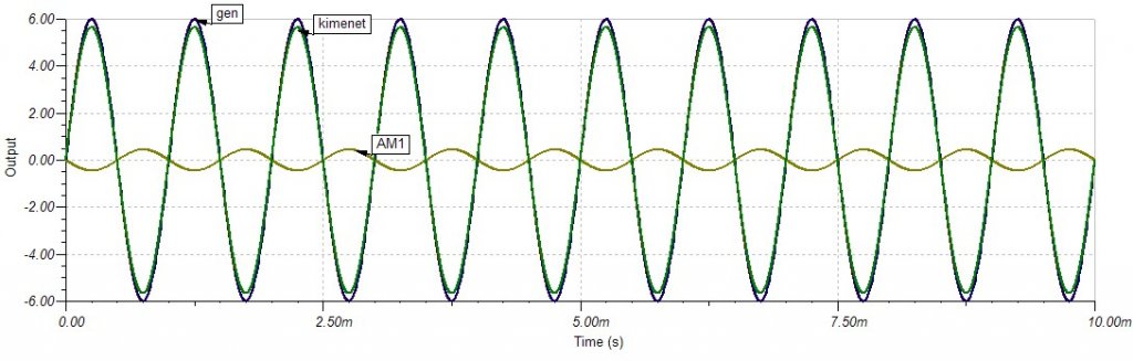 A diagramból láthatod, hogy 1-nél kisebb az erősítése. Okai: bázis-előtét ellenálláson eső feszültség, B-E feszültségváltozás, R8-R9-en eső feszültség. Azért ez oly kis mértékű, hogy a gyakorlatban nevezhetjük 0dB-esnek. Áramot viszont erősít jócskán.