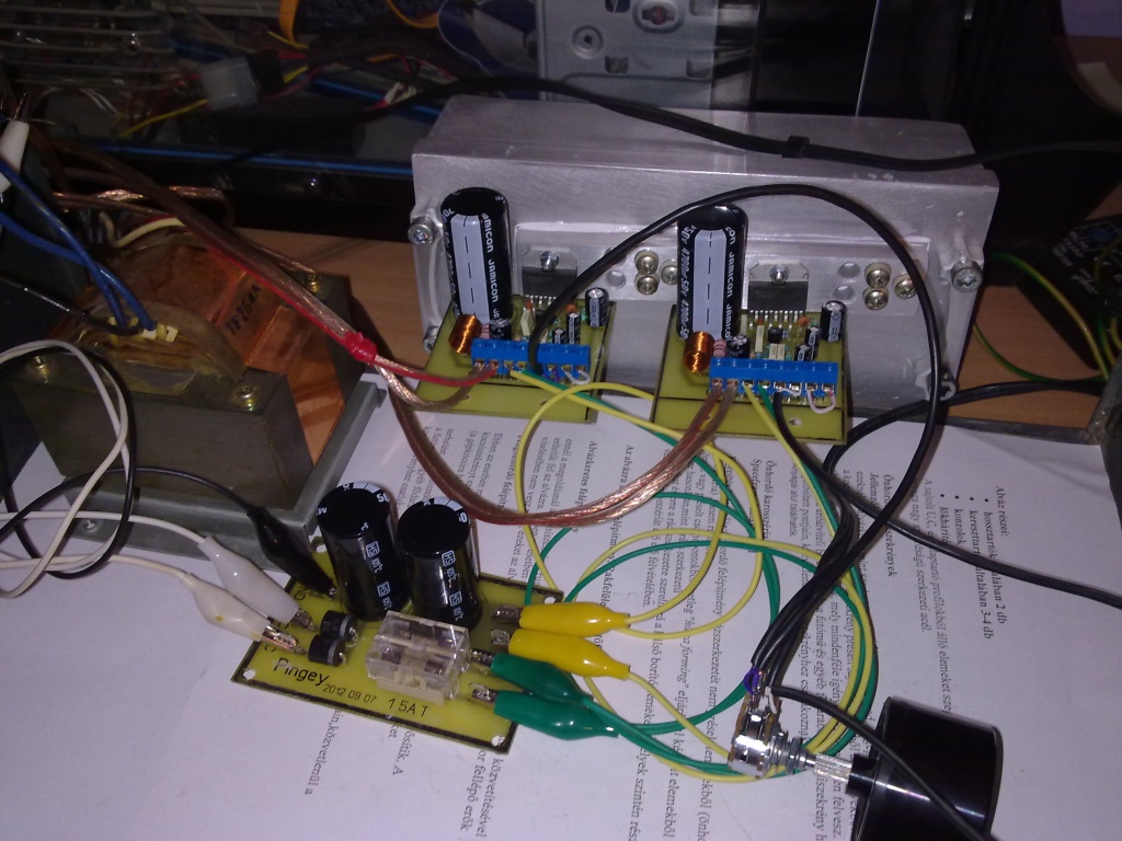 Az erősítő indítása után halk búgás hallatszott a hangszóróból, ami egy adott fokig erősödött, ha tekertem felfele a hangerőállító potin. Ha hozzányúltam ahhoz a hűtőfelülethez, melyre a tda7294 volt felfogva, ingadozni kezdett a búgás erőssége és felerősítve átjött a hangszóróba a tapintásom hangja, ha hozzányúltam ehhez a fém laphoz. Mindezidőalatt a védőlámpa bent volt az áramkörben, mintegy utolsó védelmi elem teljes üzembe helyezés előtt.