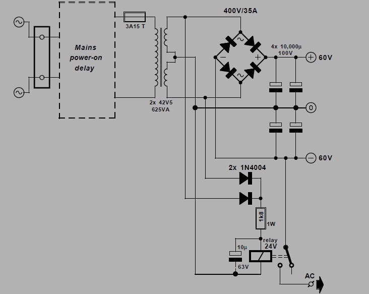 Az helytelen. A T12-nek túlságosan negatívra teszi a bázisát. Az AC-re az egyik szekundert kösd amiből a +/-60V-ot nyered. Így tud gyorsan oldani a relé a hálózati feszültség lekapcsolásakor. Remélem a T12 nem pusztult bele, a 120k eléggé korlátozta az áramot.