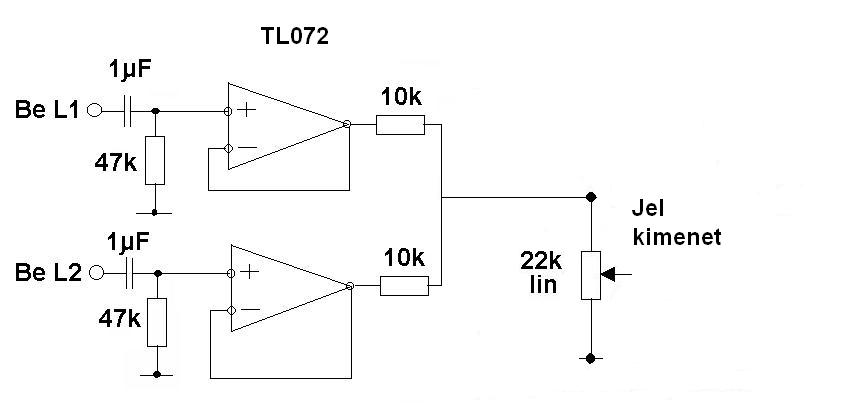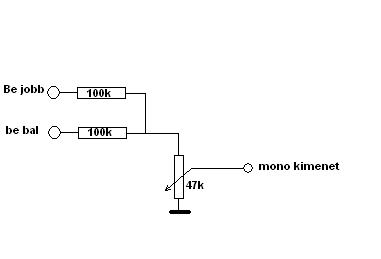stereo rendszeredhez akarsz egy sub erősítővel kiegészíteni, ha jól sejtem. Szamóca rajza egyszerű, de elkeni neked a stereo jelet, ha megvizsgáljuk a két jel egymásra hatnak, pl.ha neked egy olyan jeled van, amely csak a ball odalról jőn az ellenálláson keresztűl a jobb csatornára is átmegy forditva is igaz én is megprobáltam ezt a megoldást a szubnak az eredményét leírtam.A megoldás kővető erősitő használata.