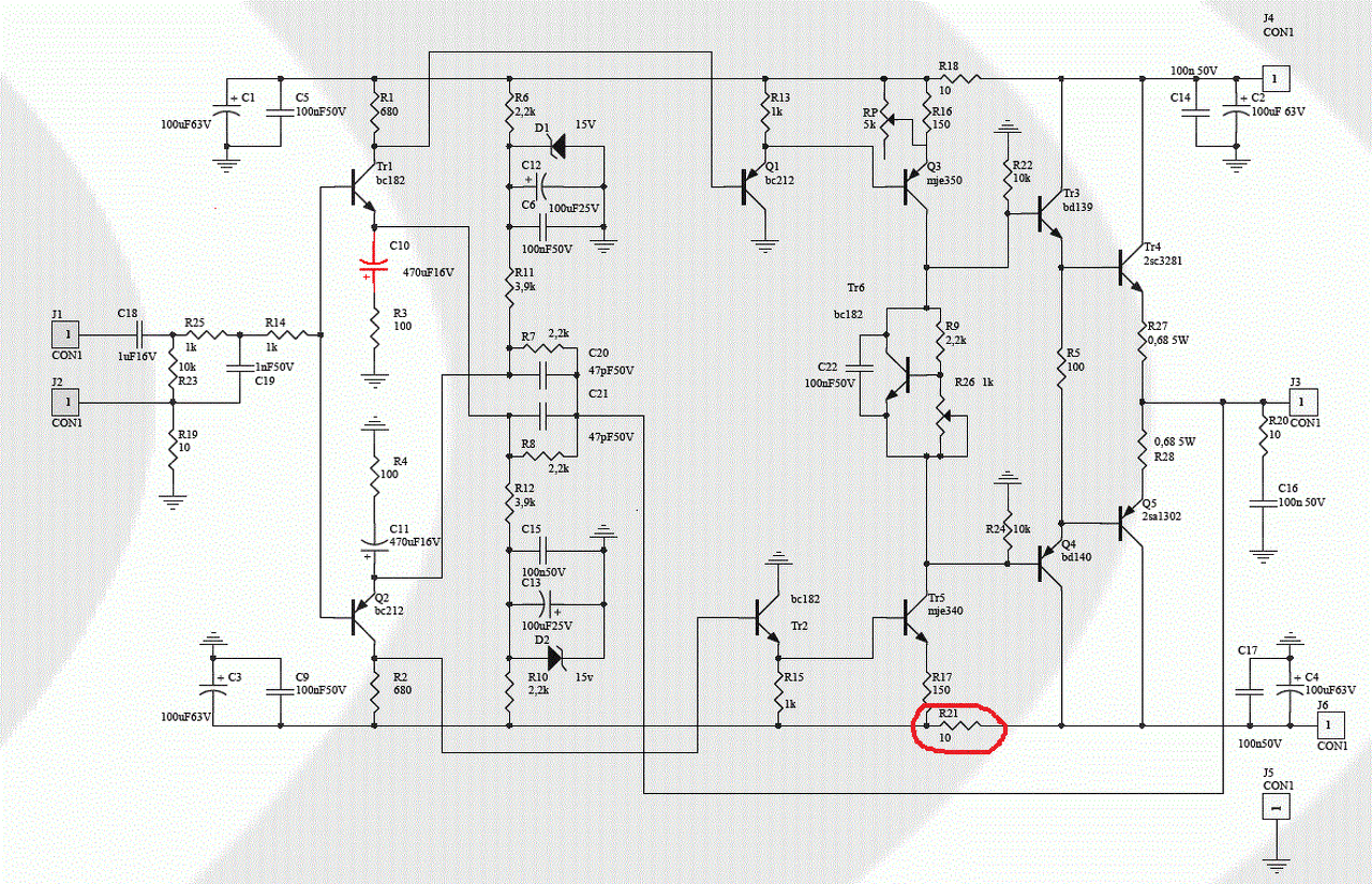 Adott az alábbi kapcsolás amivel akadt egy kis gondom. Élesztés során a negativ tápfeszültségű oldalon a bekapcsolást követően füstölni kezd a 10 Ohm-os ellenállás. Primer körben benn van az izzó így remélem nem lett nagyobb baj. Valamiért nagyon nagy áramot vesz fel az erősítő. Minden alkatrész új és jók. Panelt átnéztem nincsen rövidzár sehol. BC tranyók helyett 2sa és 2sc típusok vannak benne mivel ezekhez van a terv elkészítve. Előre is köszönöm a segítséget.