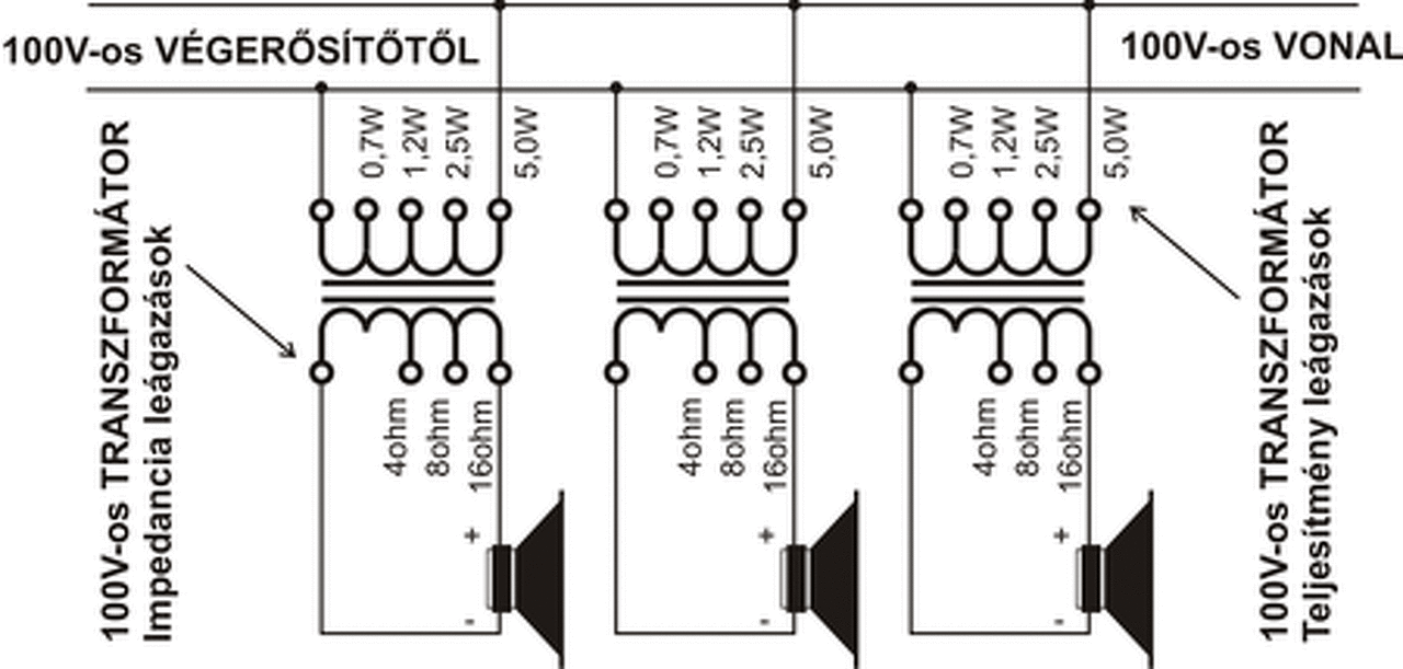 Gyuszó beelőzött. De a lényeg. a 100V-os kimenet sok hangszóró párhuzamos, egy kimenetről történő meghajtására lett tervezve. Például iskolák, pályaudvarok, áruházak stb. Az erősitő kimenetén van egy vonalmeghajtó cséve, a hangszórókban pedig egy másik, ami visszailleszt kis impedanciára. A csévén több megcsapolás is szokott lenni a megfelelő hangerő beállításához.