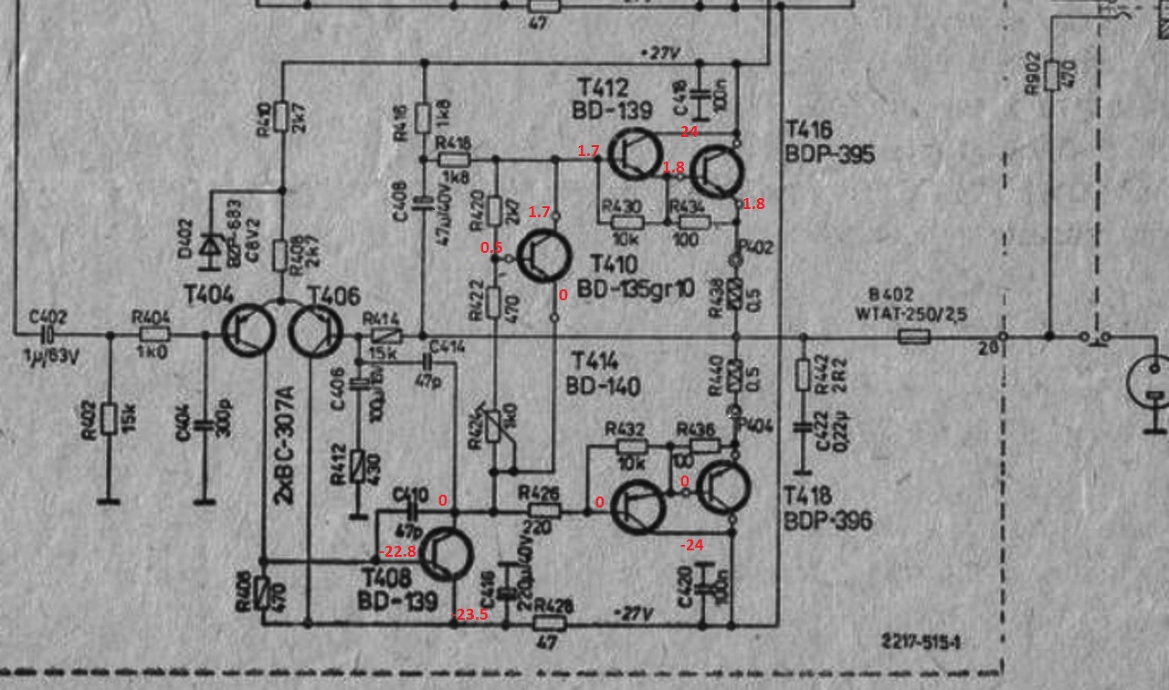 Ma ismet volt idom a javitgatasra. Talaltam is egy hibat, kit forrpony kozt volt zarlat. Amint orvosoltam megszunt a hiba, a T410 B-E labai kozt megszunt a zarlat, de tovabbra sem mukodik az erosito. Keszitettem egy ujjabb terkepet a tranzisztorok labain levo feszultsegekrol.