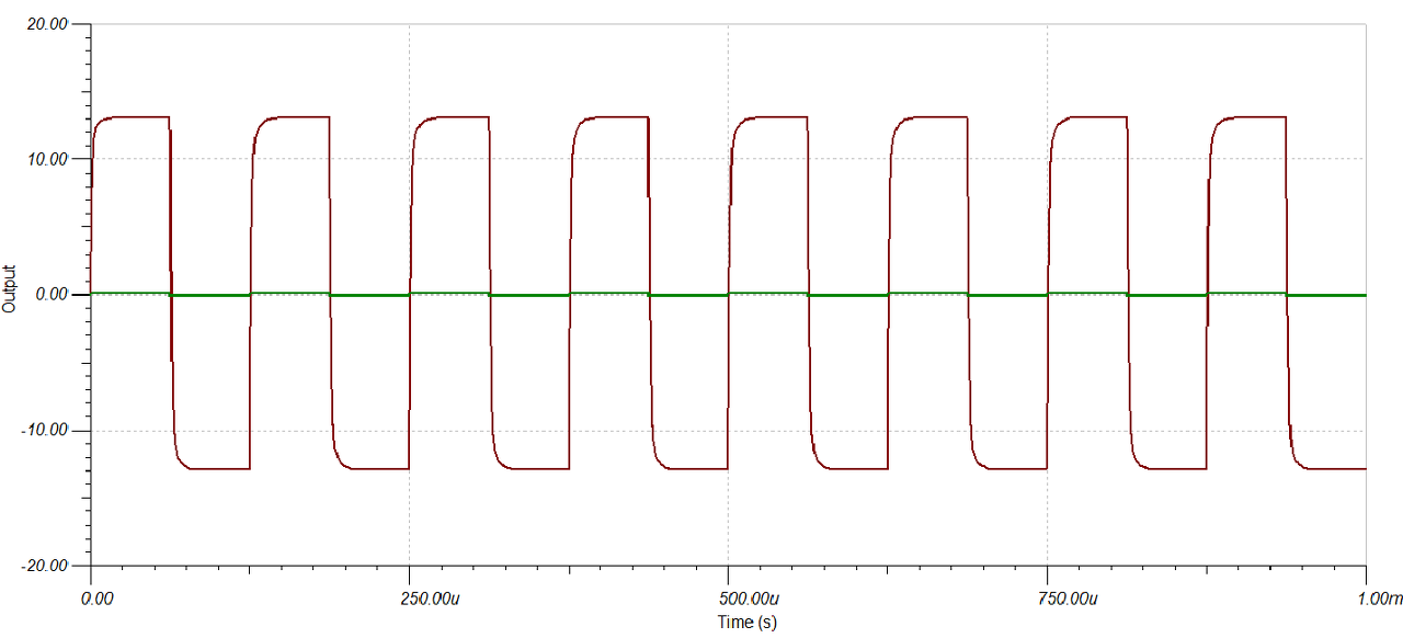Szombaton, 23 órakkor már egész jó volt a négyszögjel. Egyébként a tetejének aljának egyenesnek kellene lennie ( vagyis majdnem, de ez attól függ, van e a körben csatolókondi ) a fel-és lefutásoknak pedig exponenciális görbének. ( Fogsz egy négyszöggenerátor, ráteszel egy sorbakötött RC-t és analizáltatod a kondi feszültségét a szimulátorban. Na, ez az exponenciális fel- és lefutás. )