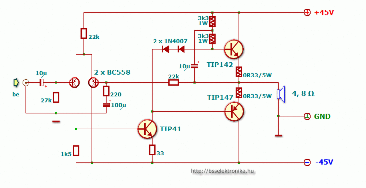 Szia! A teljesítmény a tápfeszültségből és a hangsugárzó impedanciájából jön ki. A kapcsolás annyiban érdekes, hogy ezt a feszültséget és a vele járó áramot biztonsággal el kell viselnie, valamint nagyon túl se méretezd, mert az csak pocsékolás. Erre a ±45V-ra sztereó ST151-est ajánlok, a témájában gazdag leírást találsz róla Bővebben: Link.