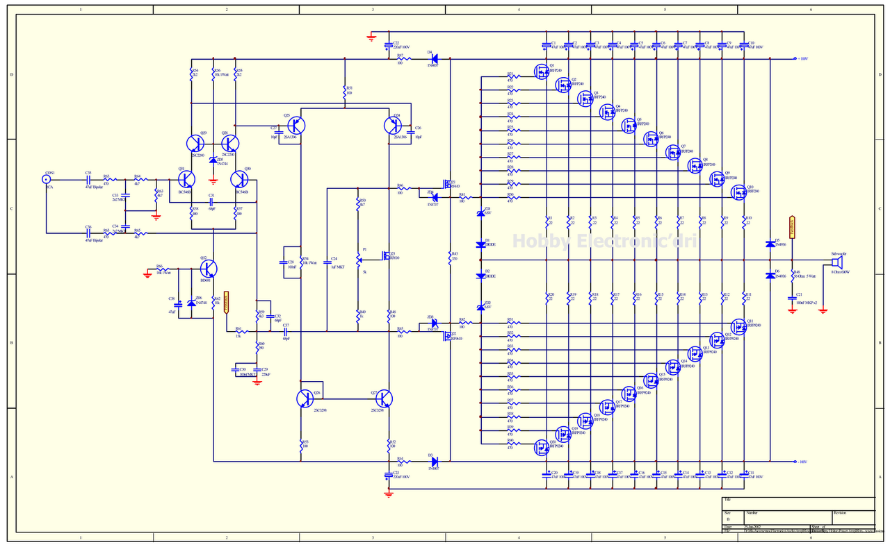 Ellenvélemény? Vagy el van rajzolva, vagy nem igazán értem hogy a meghajtótranyók bázis-emittere között minek van kondi. Annak is utána kellene számolni hogy a feszültségerősítő tranyókon mekkora disszipáció lesz, meg hogy az a rész mit csinál ott amikor mondjuk 1-2 percig rövidzár van a kimeneten (bár nem tudom mennyire vagy a nyuggerkortól), áramkorláttal együtt is.