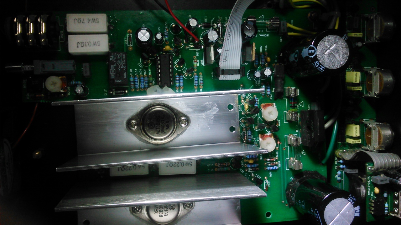 Nem egészen így néz ki. MJ11015-16 pár a végtranyó. 80 Wattos lenne 4 ohm terhelés mellett. Tettem bele vadi új végtranzisztorokat, de a hiba ugyanúgy fennál.