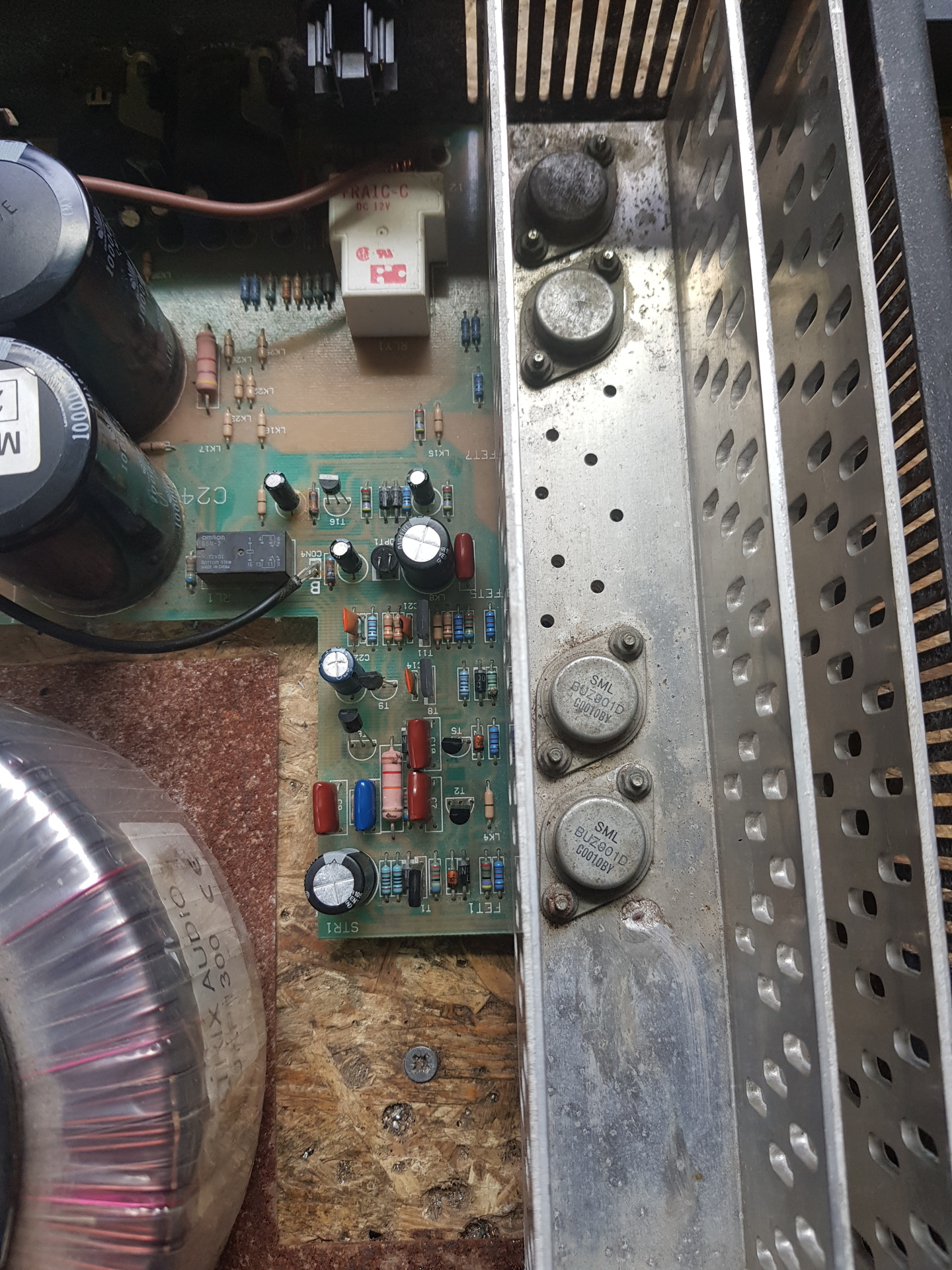 Matrix str 200 erősítőt javítok. A végfok gerjed, viszont szól, csak nagyon gyengén. Mintha nem lenne nyugalmi áram állítva... nincs drain, vagy source ellenállás. Nincs nyugalmit beállító poti. A gate, és a source között lévő 100p kondik érték csökkentek kb 40p-t mérek. A kimeneten a gerjedés 1,7MHz... Ha a kondikat kicserélem mindkét oldalon 100pF ra, akkor a gerjedés frekvenciája ugyan csökken, de az amplitója nő. A kimeneti zobel tag 2,2 ohm itt kb 10 ohm ra nyúlt. A kimeneti dc fesz kb 200 -500mV között változik. A jó oldalon minden rendben levőnek látszik, erősít is ahogy kell. Annyit még hozzáteszek, hogy ha semmilyen gate-source kondi nincs, a hibás oldalon, a kimeneti dc fesz 50mV körül van, de ugyan úgy alig erősít Valami ötlet? A feteket 2-2db BUZ901D-BUZ906D kivettem mérve jónak tűnnek .. a meghajtó tranzisztorokat MJE 340-350 cseréltem, mert az egyik 350 hfe értéke 2! volt.. Majd mivel nem változott a helyzet, minden felvezetőt ( amit beforrasztott helyén tudtam mérni) kivettem megmértem, de nem találtam hibát. Elektrolit kondik mérve, de azok is jók. Itt tartok. A jó oldal nem tükör szimmetrikus, ráadásul nem is értékelhetően van jelölve. Kapcsolási rajz nincs..