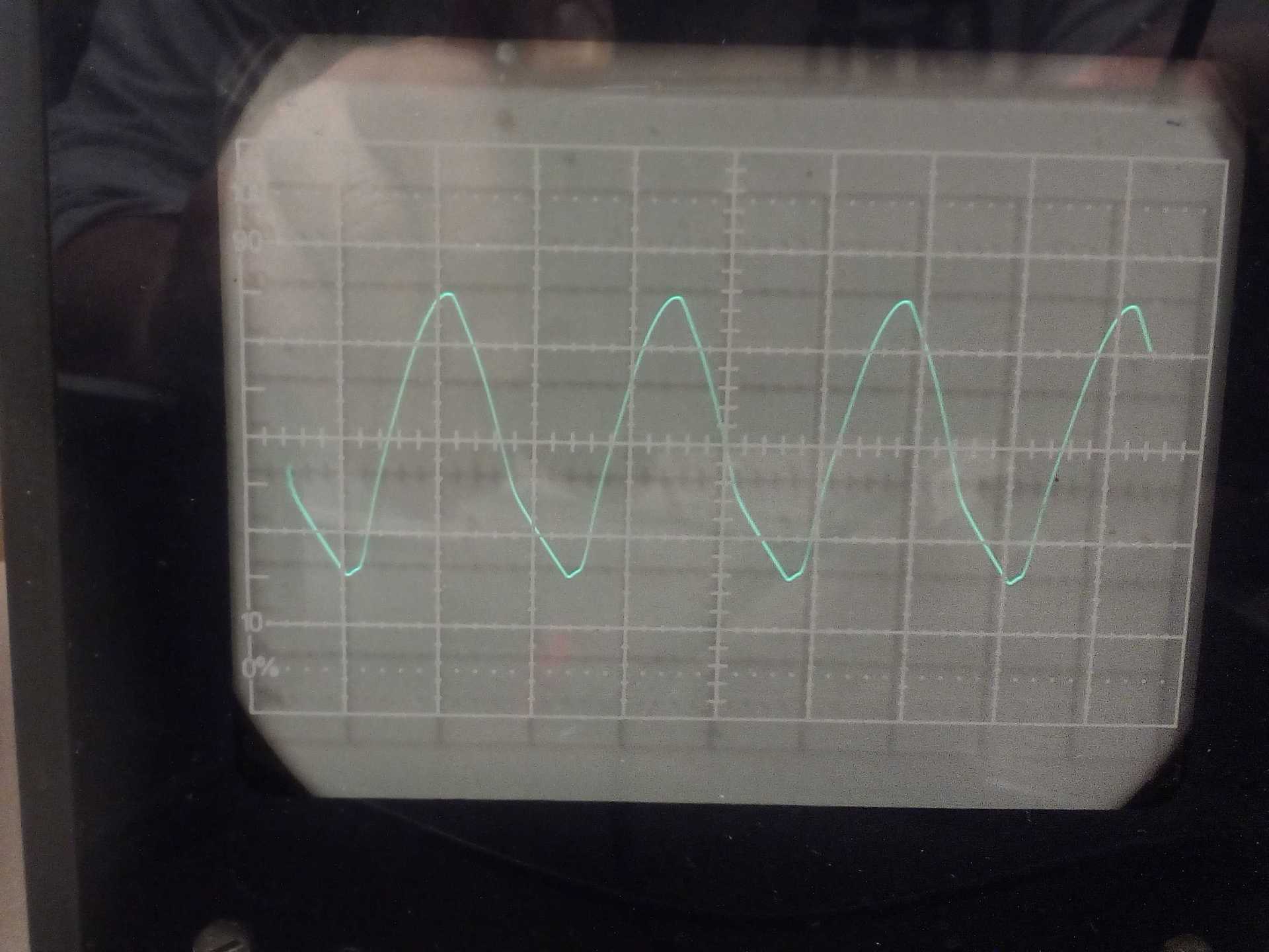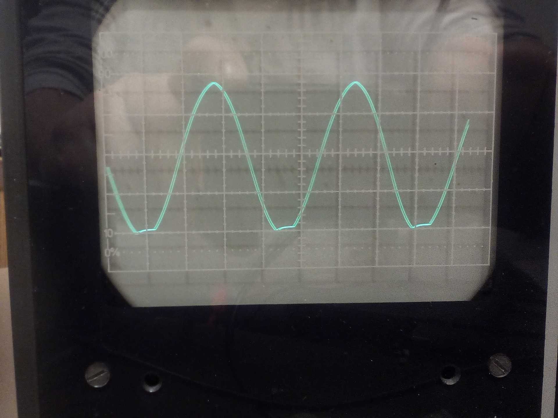 Az előző fotón nem 1KHz-es színusz látható, hanem 30KHz-es A most csatolt fotón látható szinusz az 1KHz. Itt csak az alját kezdi vágni. Ez a torzulás figyelhető meg 25-30KHz-ig, efelett már a fentebbi kép van klippeléskor.