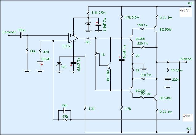 Valamikor Kb 20 éve én is megépítettem már ezt a Texast , nálam a klasszikus BD párral ment sok sok éven keresztül ! A 249-250 párossal +- 40 voltról , A TL071 nek meg ottvan a 3,3 K ellenálás ! + a 12 voltos zener : tehát így a TL csak 12 Voltot kap !Viszont úgyemlékszem én 15Voltos zenereket alkalmaztam ! Természetesen más tranyóval is meglehet építeni ami ezeket a paramétereket tudja !Ja ettől mit vársz ? MINŐSÉGILEG? Eléggé furcsa , alig alig jó a hangzása , bár egy gyakorló erősítőnek jó!