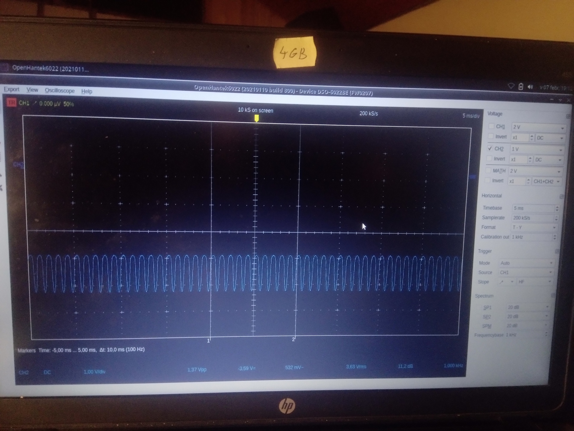 Az előbb mért 5 volt nem tudom már honnan jött, bele zavarodtam. Szóval a skóp két vezetékével rámentem az ellenállásra (lehet fordítva kötöttem rá). Amikor elkezdi a kimenet vágni a tetejét, akkor látom a képen látható jelet az ellenálláson. Ha nagyobb jelet adok neki, akkor ezen az ellenálláson nem lesz vágva a jel, viszont a kimeneten mégjobban. Biztos nem egy profi skóp, de talán látszik a lényeg.