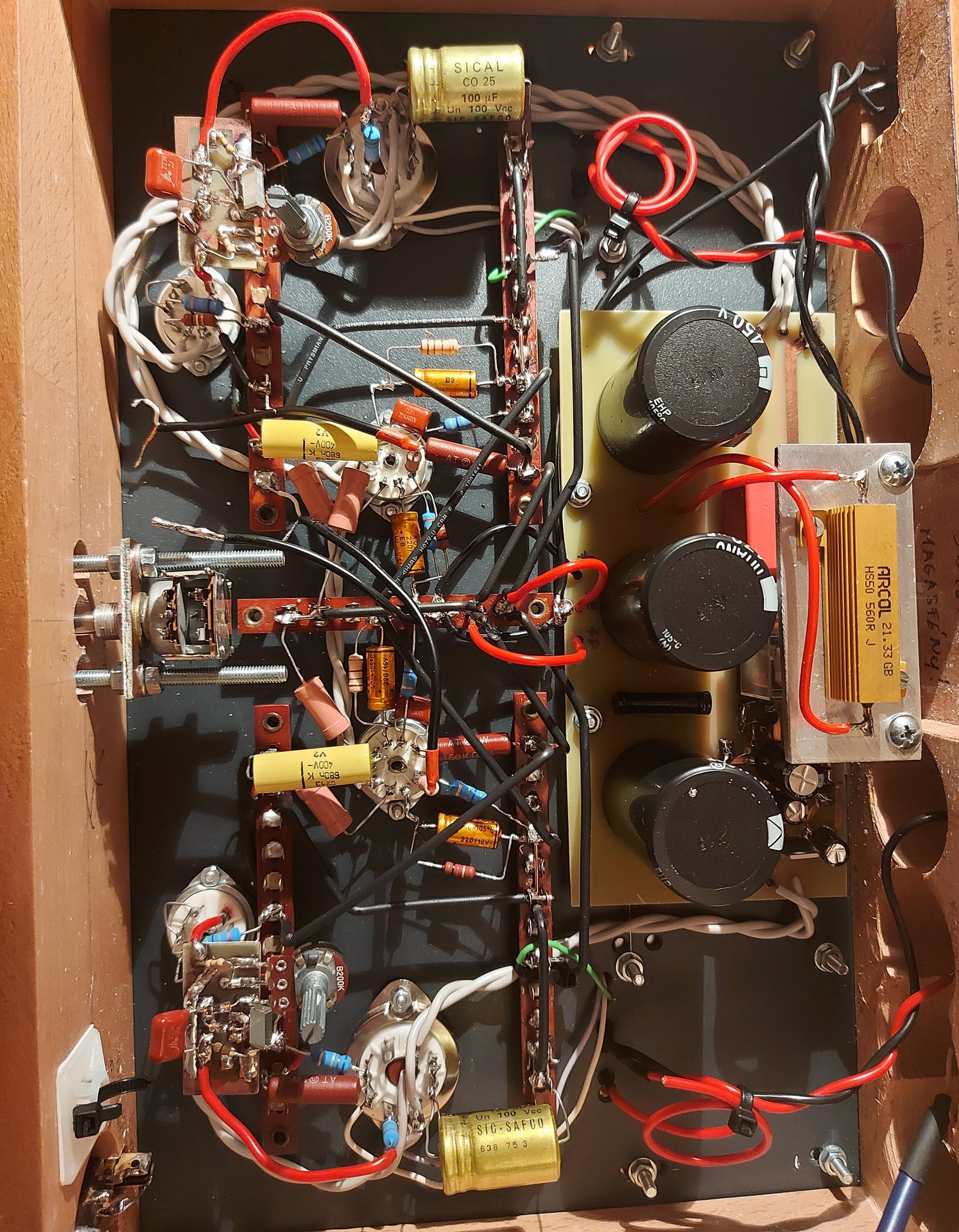 sőt akkor is búgott amikor a potit kihagytam és csak egy 470K előfeszítő ellenállás volt a trióda rácsán és a csőforszemre nem forrasztottam mást... ( csak úgy ott lógott)