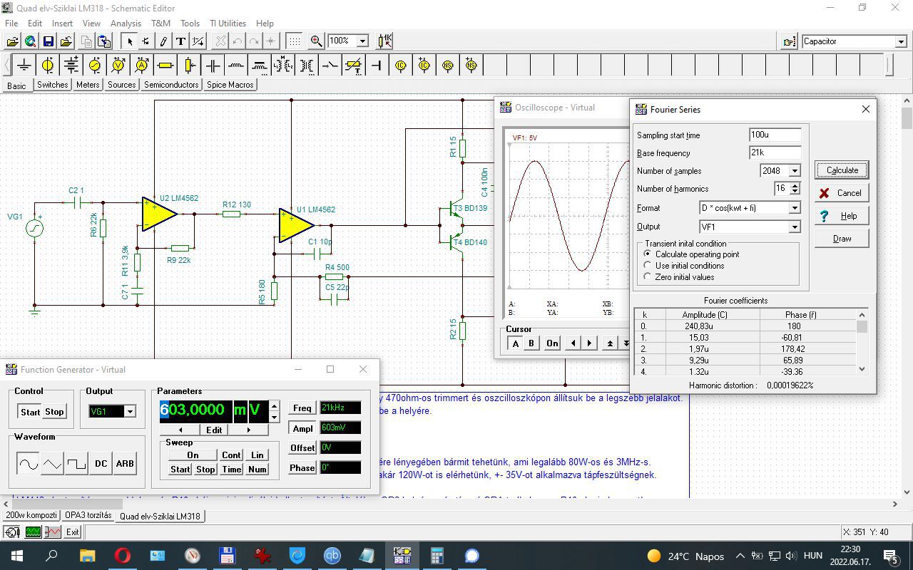 LM4562 nincs a CM-ben és rendes darlington sem. Így, LM318-cal 0.002% körüli a THD 22.5 Vpp-nél.