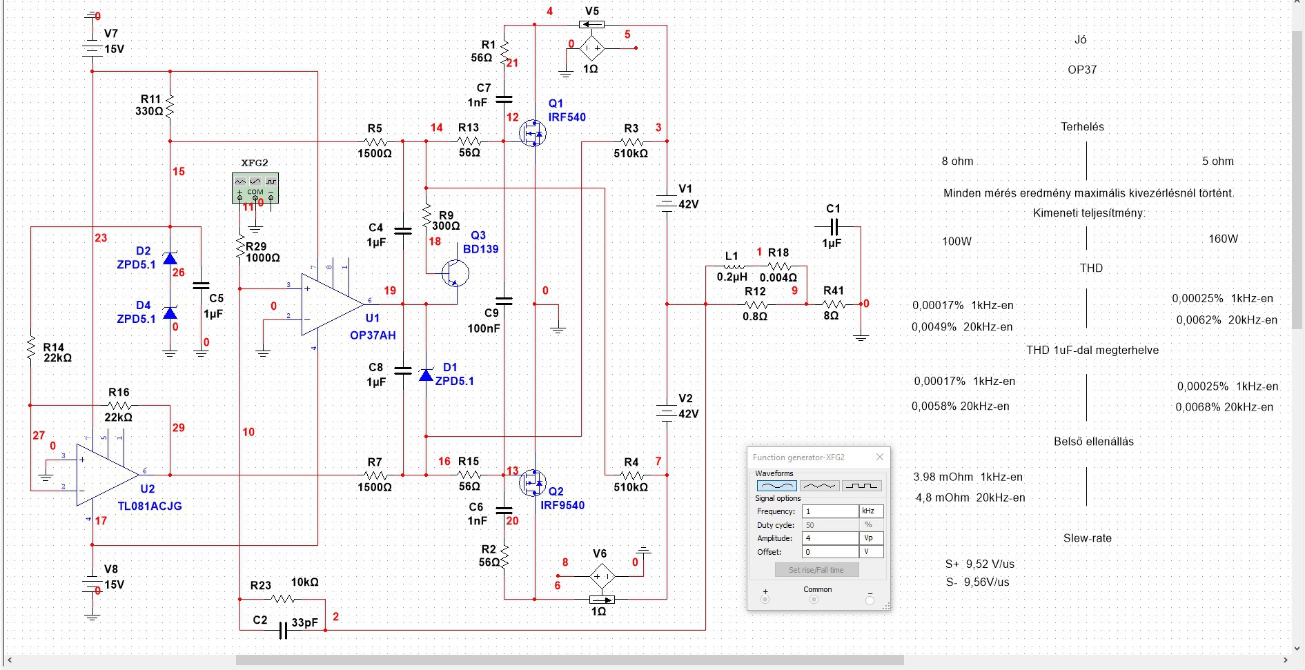 Ez csak szimuláció. De ha mondjuk 10-szer nagyobbak a torzítások, az egyszerűségéhez képest akkor is nagyon jó. Azt azért te is tudod, hogy a szimulátor modellek nem teljesen fedik a valóságot, de a durva hibákat azonnal meg lehet látni az eredményen. Na, ezért jó a földelt kimenet. Ha érdekel, pötyögd be, aztán láthatod. Vagy kérdezz, ha valamilyen részlet érdekel.