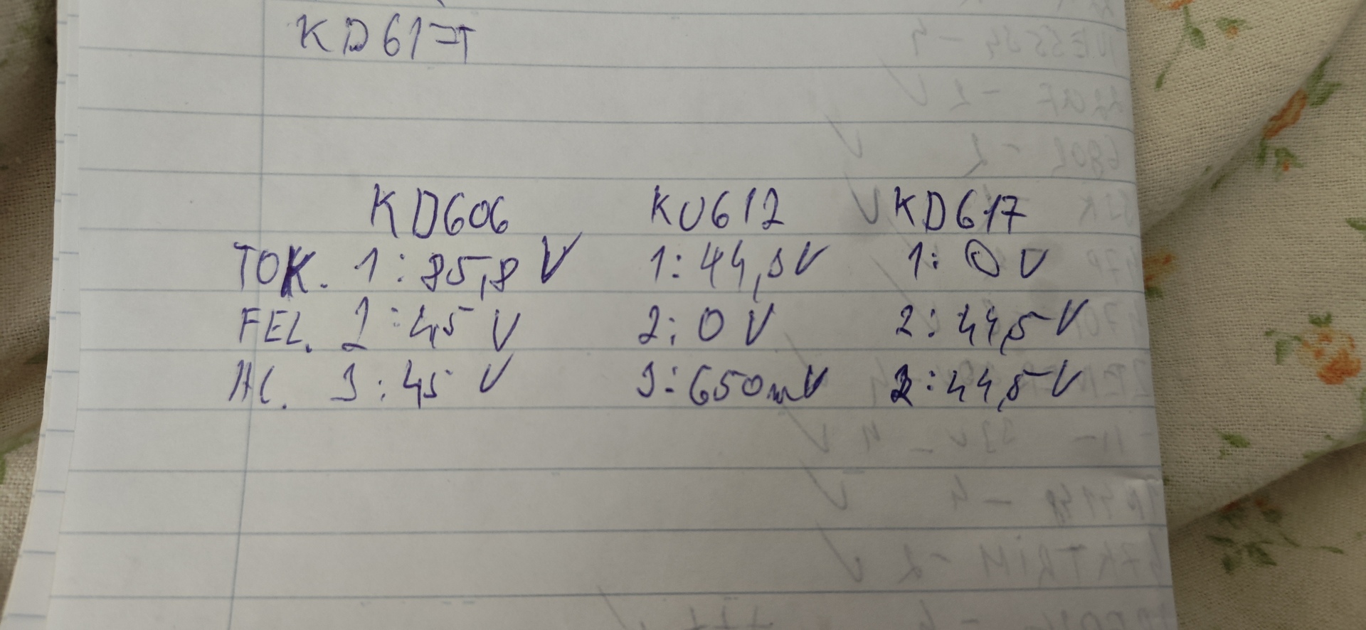 Lemértem a feszültségeket a mellékletben a tranzisztorok nevei és hozzá tartozó feszültségek.1:tokozás,2:felső láb,3:alsó láb.