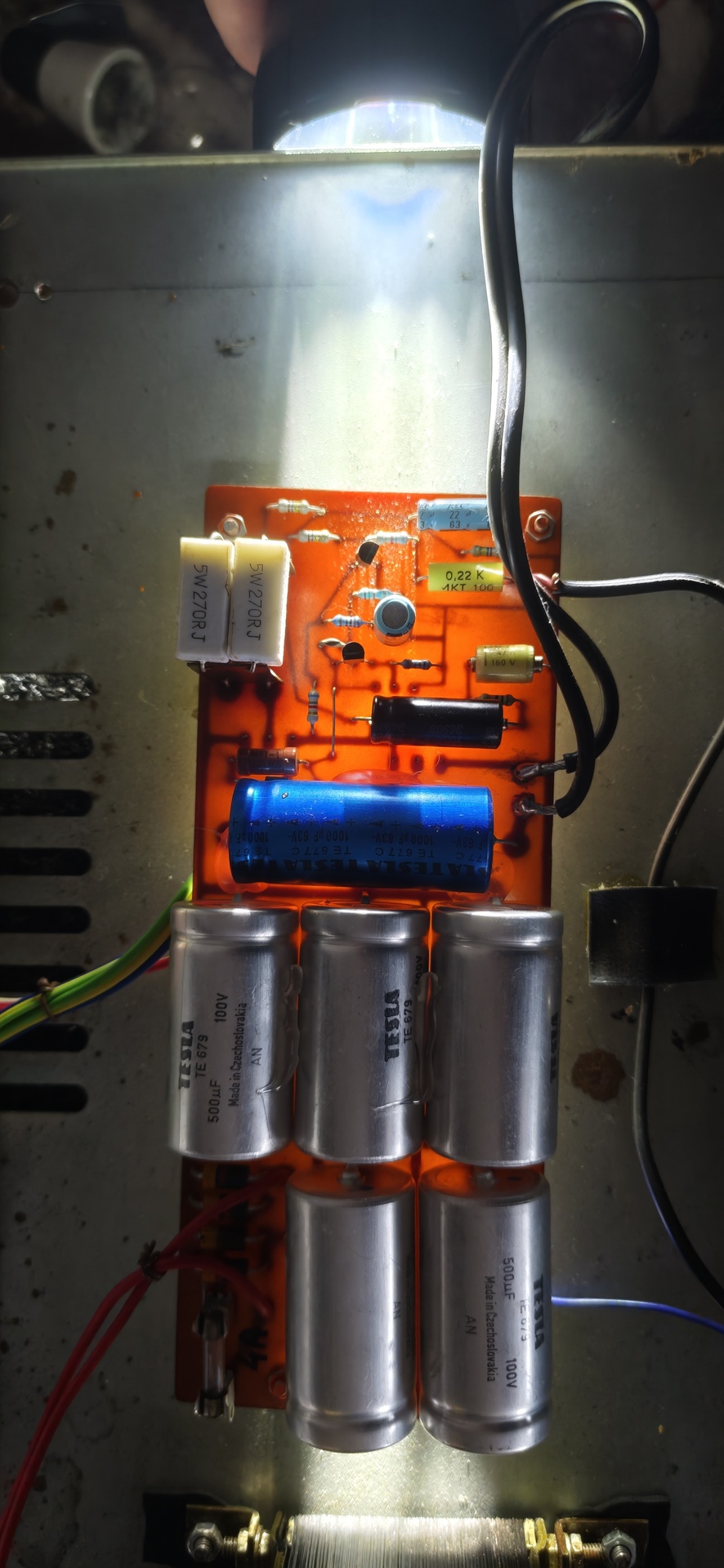 A kék színű 1000µF/63V és a barna 10 Ohm körüli ellenállás takarásában mi van? Mint ha egy dióda lenne, vagy kettő. Éppen nem látszik.