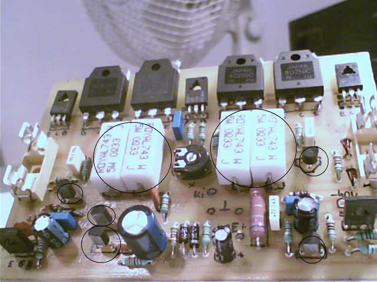 MOndom rákötöm azt a tv hangszórót és nemzúgot semmit. Mikor adtam hangjelet akkor szólt, de nagyon recsegve.Azon gondolkodtam hogy a kis tranzisztorokat biztos jó helyzetbe forrasztottam be??(az egyenes, és a félköríves oldala alapján) A másik meg az emmiter ellenálláson nemmértem feszt. Szal ezt is megkérdem: az 5Wattos ellenállás az, amit bekarikáztam?