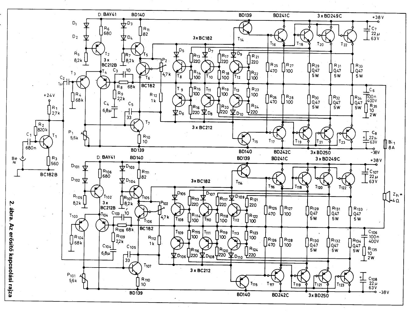 Igen ott van leírva hogy Txxx mennyi és hány volt, szal igen a végtranyókon mértem multival, az emmiter-bázisuk között. Hát igen, ez lenne a kérdés hogy jók-e? A diódák nezárnak rövidre azt már lemértem, a táp is jó szal valami a végfokon hibázik, arra kéne rájönni hogy mi... Az áramfelvétel nyugalomban, hangszóró sincs rákötve 26mA volt a pozitív tápágban. A munkapontoton mitértesz pontosan?, szkópom továbbra sincs A kapcsrajzot proksa osztotta meg velünk még a kapcsrajzot. Minden mást megtalálsz a fentebb, amit belinkeltem. Amúgy ha rákötök mindent, be és kimentek, annyit produkál hogy bekapcsolom pukkan egy kicsit a hangszóró (gondolom a 6VDC miatt) majd egy árva hangot nemejt ki magából.