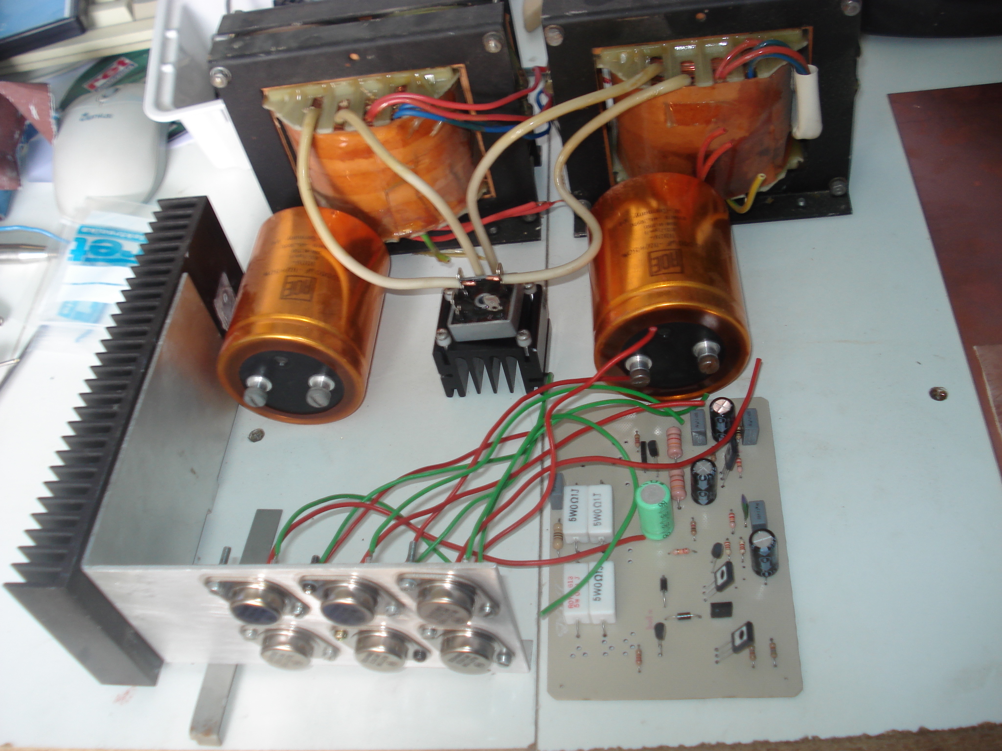 En nem ajanlom, hogy abban a formaban epitsd meg a tapegyseget az erositodhoz ahogy a korabbi csatolt kepen lathato. A ket kulon trafohoz csinalj ket kulon tapot (azaz mindegyiknek sajat graetz hid + puffer) es az igy kapott 2 egyenfeszultsegu tapot kosd megfeleloen sorba, hogy egy kettos tapod legyen. Meg 1 kerdes: ugye a vegtranyok allatti csillam szigetelok mindket oldalan van szilikon zsir v. vmilyen mas hovezeto paszta?