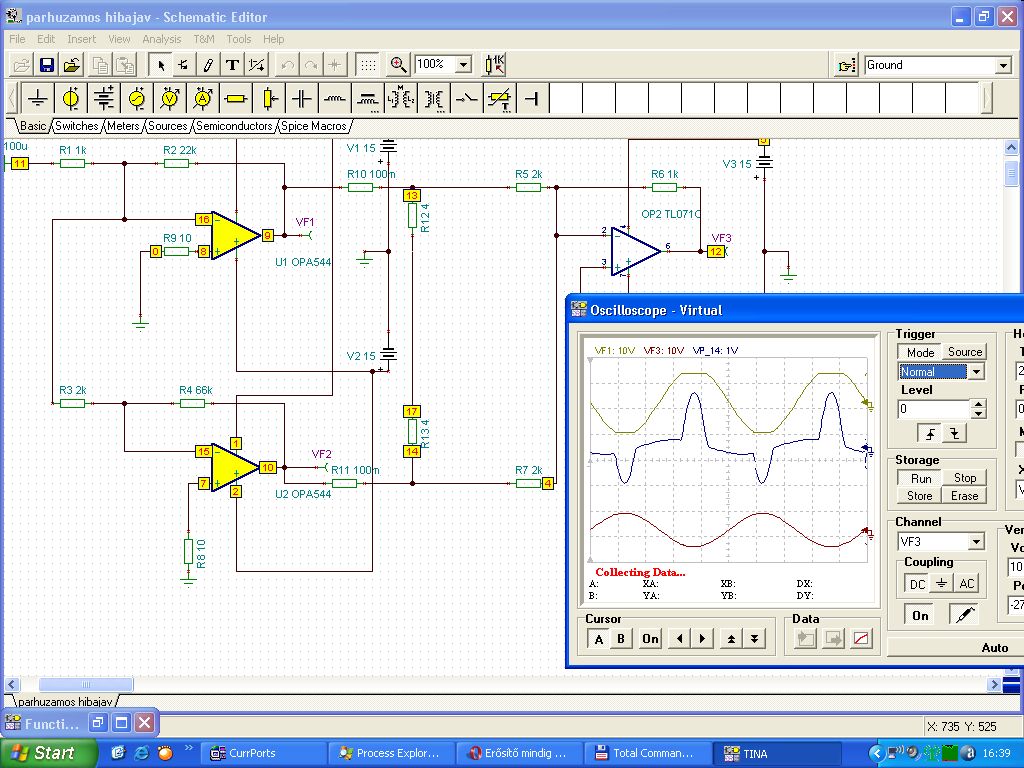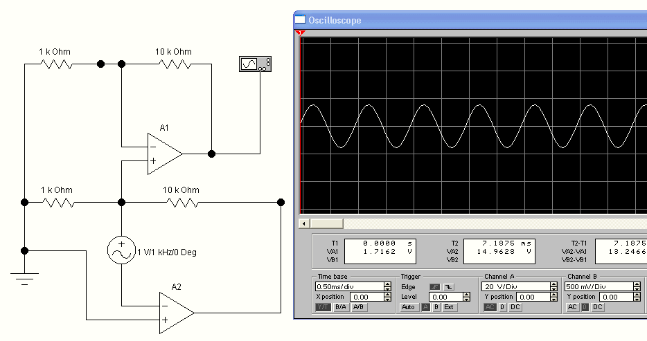 A2 hibázik, A1 kijavítja, de visszamegy a hiba A2-be, ami már így kétszer akkorát hibázik. A1 ezt is kijavítja. A2 erre 4-szer akkorát hibázik, stb. A rendszer túlvezérlődik. Ez világosan látszik a szimulációból! highand! Azt lásd be, hogyha A2 hibajelet képez, akkor azt A1 nem csak a kimenetén jeleníti meg, de az invertáló bemenetén is! 1x-esen erősítve, fázisfordítás nélkül, ami A2-be visszajutva ismét az eredeti hibát növeli, az pedig nemcsak nagyobb korrekciót, de nagyobb válasz hibajelet csinál. A kör 1x-es erősítésű (100%) és pozitív! Sipos kapcsolása nem ez volt...