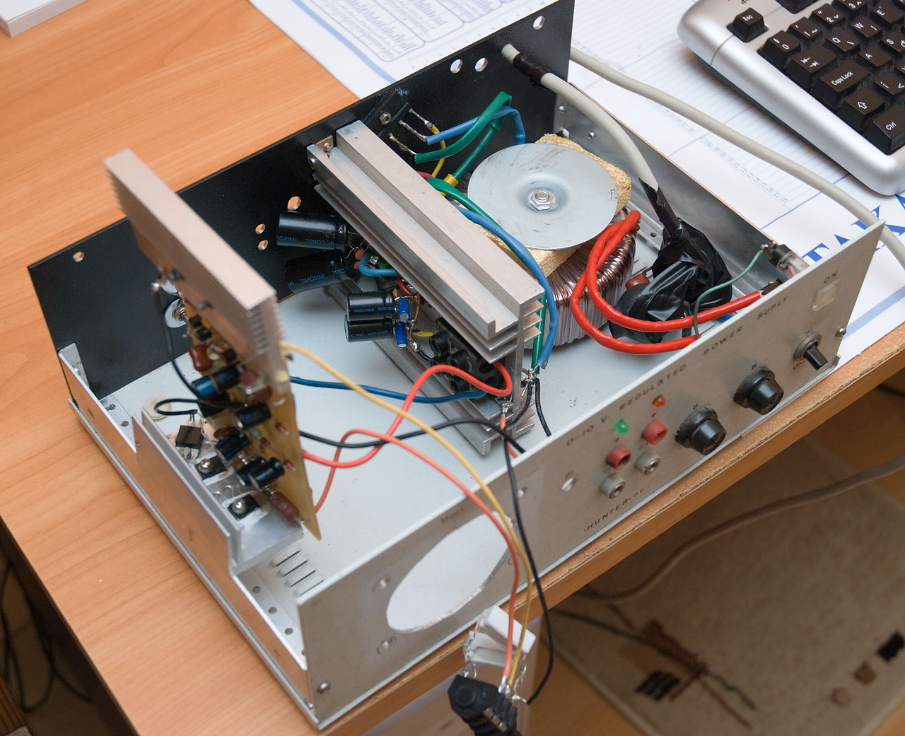 Gyönyörűen elrendeztem a doboz belsejét amibe bekerül az erősítő. A hűtőborda, amin a stab IC-k vannak, pont takarja is a trafótól az erősítőt. A kábelezést a lehető legrövidebbre vágtam, és a csillagpontot is létrehoztam. A 33pF helyett is betettem a kapcsolásban is szereplő 330pF kondit, igaz, ez fólia. Egy alkatrészt, ami eddig átívelt néhány alkatrész felett, szépen megigazítottam. A pótmétert, amivel a munkapontot állíthatom, is ellenállással váltottam ki. Erreföl az erősítő most sokkal durvább hangokat produkál, mint valaha. Rendesen FM vevőként működik, csak épp csatornát nem talál Olyan hangosan sistereg sokszor, hogy alig bírom a fülemen tartani a fülhallgatót, plusz még brumm is keletkezett.Lesnétek, hogy miféle hangok ezek, talán fel is veszem. Már-már ott tartottam, hogy szétrúgom az egész hóbelevancot. De van 1-2 ötletem, hogy mi okozhatja ezt a nagyfrekis gerjedést, mert 1-2 dolog változott az utóbbi HSZ-em óta, amikor teljesen rendben volt a hangja. Szerintetek melyik? 1. A csillagpontot a stabIC-k hűtőbordáján hoztam létre. (Mindkét IC csillámmal van felfogatva, így mertem csak) 2. A 330pF fólia lett. (visszacsatoló kondi) 3. 2x17000µF helyett 2x4700µF a szűrés. (Helytakarékosabb) 4. A munkapont beállító ellenállást kettőből hoztam létre, és ezeknek az összesodrása (és persze forrasztása) felfelé áll picit, mint egy antenna. 5. A technika ördöge bújt bele