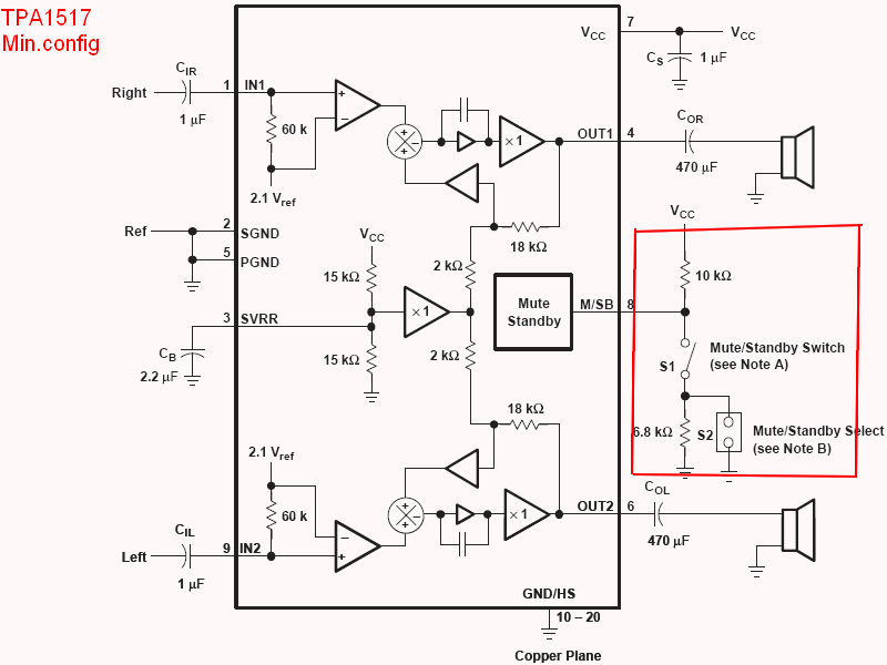 Texastól rendeltem TPA1517-es IC-ket. Megérkeztek Ez egy 2*6 W os stereo erősítő IC. Adatlapján a min.config- kapcsrajzal kapcsolatban lenne egy kérdésem. A képen bekeretezett rész elhagyható? Nekem nincs szükségem mute és stand by állásra. ha bekapcsolommenjen. Szóval ez a rész teljes mértékben elhagyható, vagy nem ártana "otthagynom" valamt?