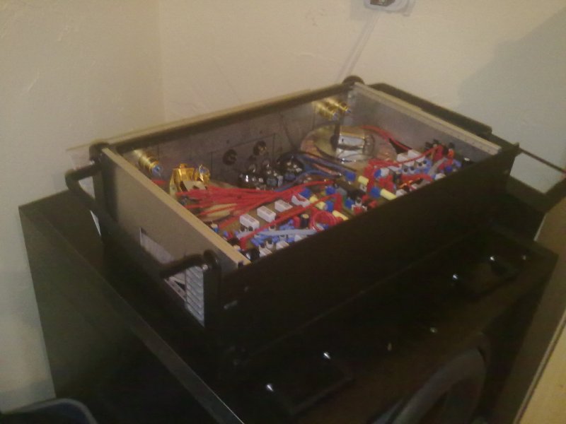 Noss, lassan azért halad az erősítő bedobozolása, bár időhiányban mindig sajna ezt úgy kell kiimádkoznom neki Mindenesetre Nagy lelkesedéssel csinálom így is, mert tudom ,hogy ha kész lesz magáért beszél majd a hangja illetve a teljesítménye. Az előlappal még sehogy sem állok de az oldal illetve a hátulsú, lemezeken a már bejelölt furatok illetve idomokat, sikerült kivágnom, Az elejére szép nagy fekete fém potméterek kerülnek majd, és a ledes visszajelzések. Külön előfokot készítek majd hozzá, ami ugyanilyen pa-dobozban lex ,csak az 2U magas. Így ha zenélni viszem is megállja a helyét, ha pedig ithon hallgatom ,az az illesztés révén majd remélem még jobb lesz. Már csak Abban vagyok tanácstalan, hogy milyen kapcsiból csináljak előfokot hozzá, h annak valóban szép hangja legyen... A 2 Vu meter már megjött hozzá, az biztos bent lesz Hófehér háttérmegvilágítással ,akárcsak mint a végfok potmetereinek a külső silicon pereme Végezetül Pár kép! Ha esetleg valaki tudna ajánlani nagyon jó hangú illesztést azt elfogadnám, én opa szériában gondolkodom eddig ..