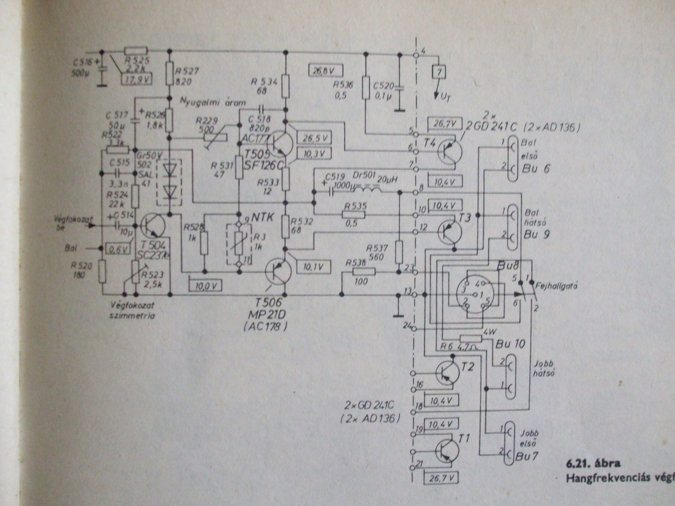 A készülék kapcsolási rajza a Sztereó rádiók szervizkönyve III. kötetében található. Az erősítő rajza a 87. oldalon található. A kapcsoláson látható, hogy a germánium tranzisztorok milyen szilícium tranzisztorral helyettesíthető. BC109, BC182, BC301,BC439 és a végtranzisztor lehet BD242. Természetesen más típus a BC109 helyett oda is BC182 és a BC301, BC439 helyett is tehető be BD137, BD138 meghajtó tranzisztor. Ezeket és a panelen levő elektrolit kondenzátorokat kicserélve más megítélést kap a készülék.