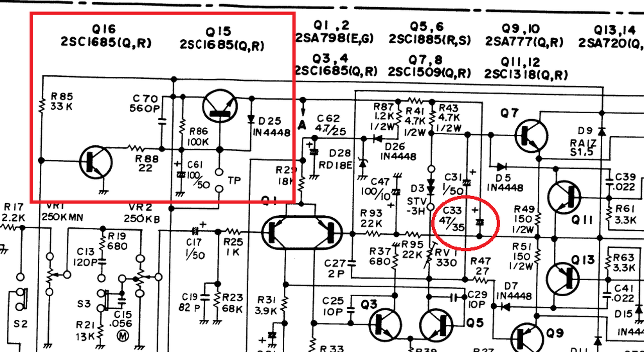 Mindkét oldali végfok hibával került hozzám. Illetve azt mondták, hogy nincs más gond. Az eredeti véget MJ15003, MJ15004-el helyettesítettem( ez volt itthon) , a meghajtókat is 2SD, 2SB párral ami mind fesz, mind áram értékben megfelelt. A maradék hibás tranzisztorokat pedig BC 546 - BC182-re, BC556 - BC558-ra cseréltem. Az egyik oldal élesztése simán ment. megfelelő nyugalmit állítottam be a service manual alapján. Viszont a másik oldal ha megfeszülök sem akar összejönni. Mellékelek két képet feszültség értékekkel. A rajzon megjelölt feszültségek értékek az ellenállásokon mérhetőek, kivéve a kimeneti feszültség, a Zenner diódán mért feszültségek, és a trimmer potik közepén ezek értelemszerűen a GND-hez képest van mérve. Valakinek ötlete? Ha valamilyen feszültség értéket mérnem kell még, szóljatok. A hozzászólás módosítva: Márc 20, 2016