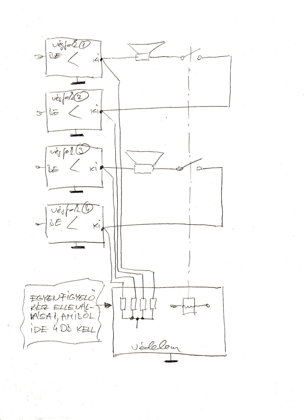 Milánnak majdnem igaza van. Abban van egy pici kis tévedés, hogy nem kell több védelem. Az egyenfigyelés erősítőnként egy ellenálláson keresztül csatlakozik az elektronikához (ez általában 10k körüli érték). Viszont ebből nem csak 2 lehet, hanem akár 4, vagy még több is.