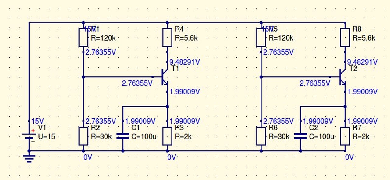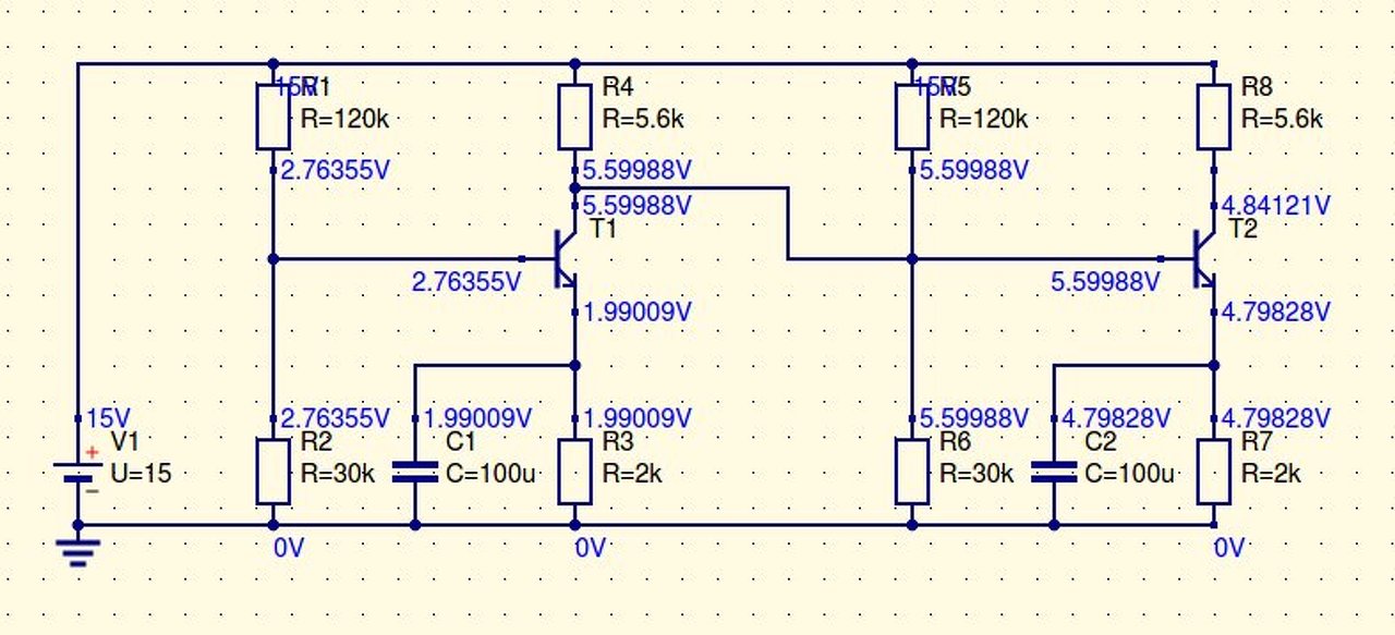Megjegyzem még, hogy a két fokozat galvanikus összekötése, főleg a kiszámolt értékek ismeretében, marhaságnak tűnik - legalább is az analóg üzemmód szempontjából. Az 5.6Kohm-os kimenőellenállás után az R5,R6 "feszültségosztó" funkciója alig érvényesül, és a T2 bázisa olyan magas feszültségre kerül, hogy az R7 által kiszámolt áram az R8-on túl nagy feszültséget hozna létre. Akkorát, hogy - elvileg - a kollektoron alacsonyabb feszültségnek kellene lenni mint az emitteren. Ez persze nem lehetséges, hanem amikor a tranzisztor kollektora a bázis feszültsége alá ér, a tranzisztor kapcsoló üzemmódba kerül, azaz itt kinyit. Ez nem az aktív üzemmódja, és ilyenkor másként kell vele számolni.