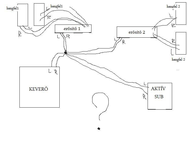 A kérdésem az volna ,hogy: egy keverő pultra aminek csak egy sztereó mester kimenete van, arra lehet-e 2 erősítőt(amik nem ugyan olyan teljesítményűek) és egy aktív subwofert rákötni úgy ,hogy ne legyen túl sok veszteség és legalább egy egész éjszakát magas hangerőn üzemeljen.(ha lehet akkor nem külön 3 kimenetes erősítővel szeretném megoldani)csatoltam egy képet ,hogy hogyan képzeltem.