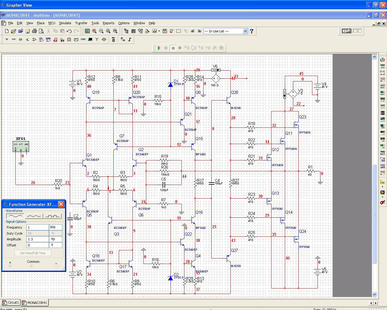 Még volna rajta mit csinálni, meg lehetne rajta finomítgatni, de annyira nem érdekelnek az analóg erősítők. Az alapharmónikus a kimeneten 41 V, a tápfesz meg 45, tehát egészen rendesen ki van vezérelve.