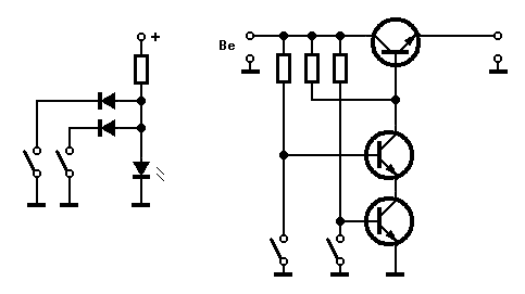 A jobb oldali ábra már (talán) közelebb van a kérdésben feltetthez (bár a konkrét alkalmazás ismereretének hiányában nem lehet pontos kapcsolást kreálni). A pozitív ágban elhelyezett NPN tranyó akkor vezet (a kimeneten megjelenik a bemenőfeszhez nagyon közeli érték), ha MINDKÉT kapcsoló ZÁRT. Ekkor az ellenállásokon a bázisokra vezetett nyitófeszültség nem tud érvényesülni, mindkét alsó tranyó zárt, tehát a kapcsolótranzisztor a bázisába ellenálláson vezetett pozitív fesz hatására nyit. Ennél a kapcsolásnál a két alsó tranzisztor pozitívra menő ellenállását elhagyva, egy megfelelő soros ellenállással a bázisokra vezetett pozitív fesszel is elérhető a működés.