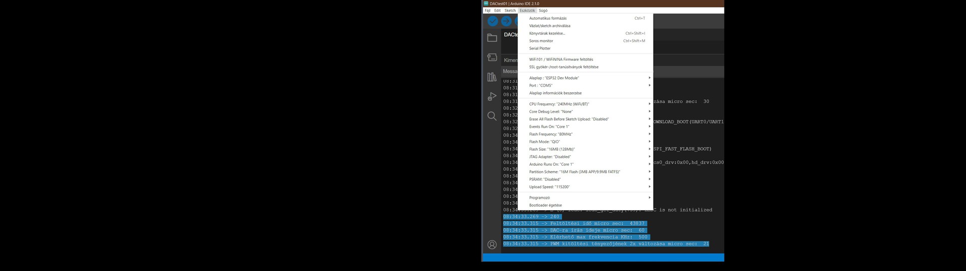 Ezzel még semmit sem, csak tesztelem mit bír. A beépített DAC ezek szerint nekem nem elég. Tudom, hogy van beépített cos generátora, de pl nem tudom annak mekkora a frekije maximum, adott 8 bit felbontás mellet, időben pedig úgy, hogy egy periódusra 10 érték essen. A port írási sebessége éppen ezért lenne fontos, mert parallel DAC simán lehet ilyen gyors, ami nekem kell, az ESP tudná etetni. A portokat definiálhatnám úgy is, hogy 8bit + a DAC egyéb vezérlő lábai. A PWM-el való jétékot a korábbi tapasztalataimból tettem bele, mert azzal is lehet jelet előállítani.