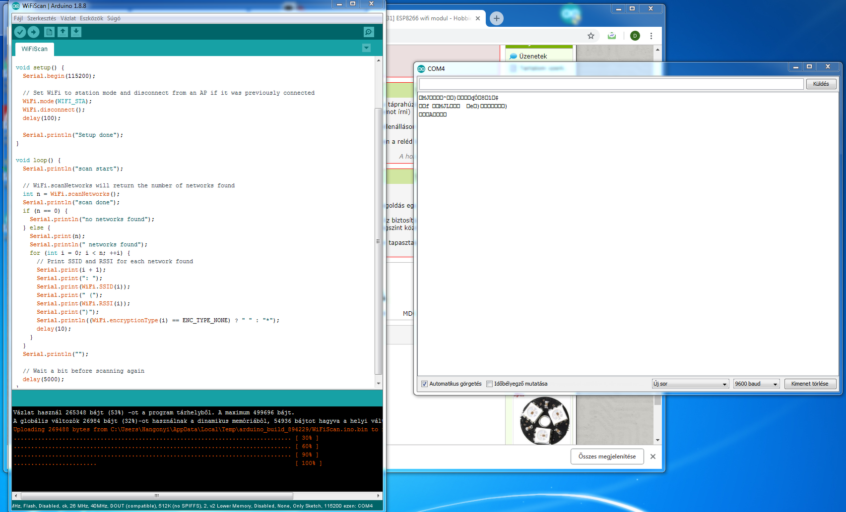 Próbálom magamat beleásni az ESP 01-esek lelkivilágába, de már az elején gondba ütköztem! Arduino IDE feltelepítve ESP packett telepítve a sárgatokos programozót használom forrasztottam rá egy jumpercsatit a flash zárásához! Ide példaprogramjából feltöltöttem a WiFi scan kodot, lefordit, feltelepül, és ilyen marhaságokat küld vissza! A gép steril! Teljesen szüzen van telepítve a ch driveren és az arduinon kívül csak a chrome van rajta. Nekem úgy tűnik mintha működne, csak a karakterkodolásba lenne gond! aztán lehet hogy ugy rossz az egész ahogy van!Amúgy küldi szépen folyamatosan az adatokat helyesebben kriksz-kraksz-okat Szerintetek mi lehet a gond?