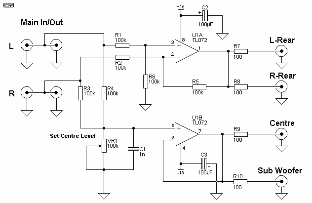 A bemenet után egy LM 1036 N-es szabályzóra gondoltam és utána szét kellene bontani valahogy a sztereó csatornát 5.1 re. Persze tudom még mielőtt beszóltok, ebből soha nem lesz igazi 5.1 de valami hasonló csak össze hozható. Két verziót találtam a neten. Az egyik egy sorround áramkör a uPC 1892 vel de ahogy nézem ez nem tartalmazza a mély láda meghajtásához a kimenetet. És van egy egyszerübb A TL072 IC vel ez már 5.1 kimenetet tartalmaz, a kérdés, hogy mennyire jó. Ezeket kötném egymásba tehát hangszin és hangerő szabályzó+TL072 re épülő dekóder+Az eredeti 7 db TDA2030-asal épített végfok.