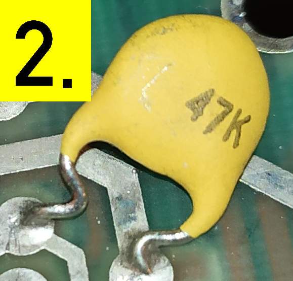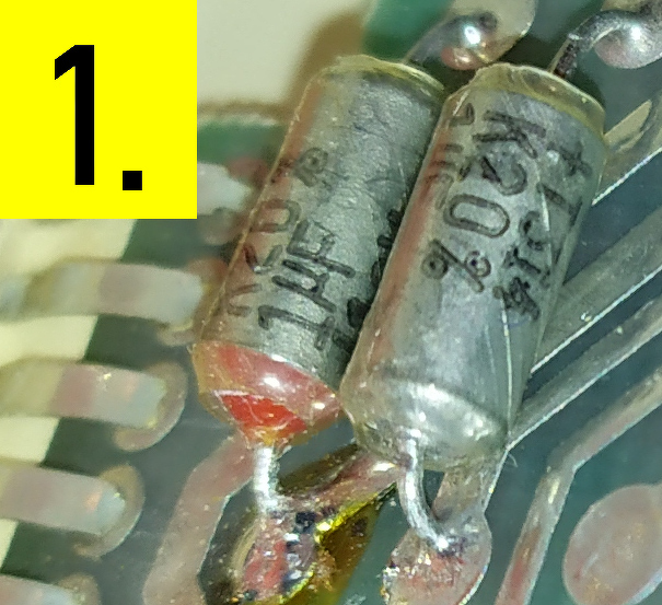 -1. Ez 1µF és a feszültségeik (10V és 35V) biztosak. Én tantálra tippelek, de a stiroflex is hasonlóan nézett ki. Mindegyiknek a pirossal jelölt lábán van a pozitívabb feszültség.
