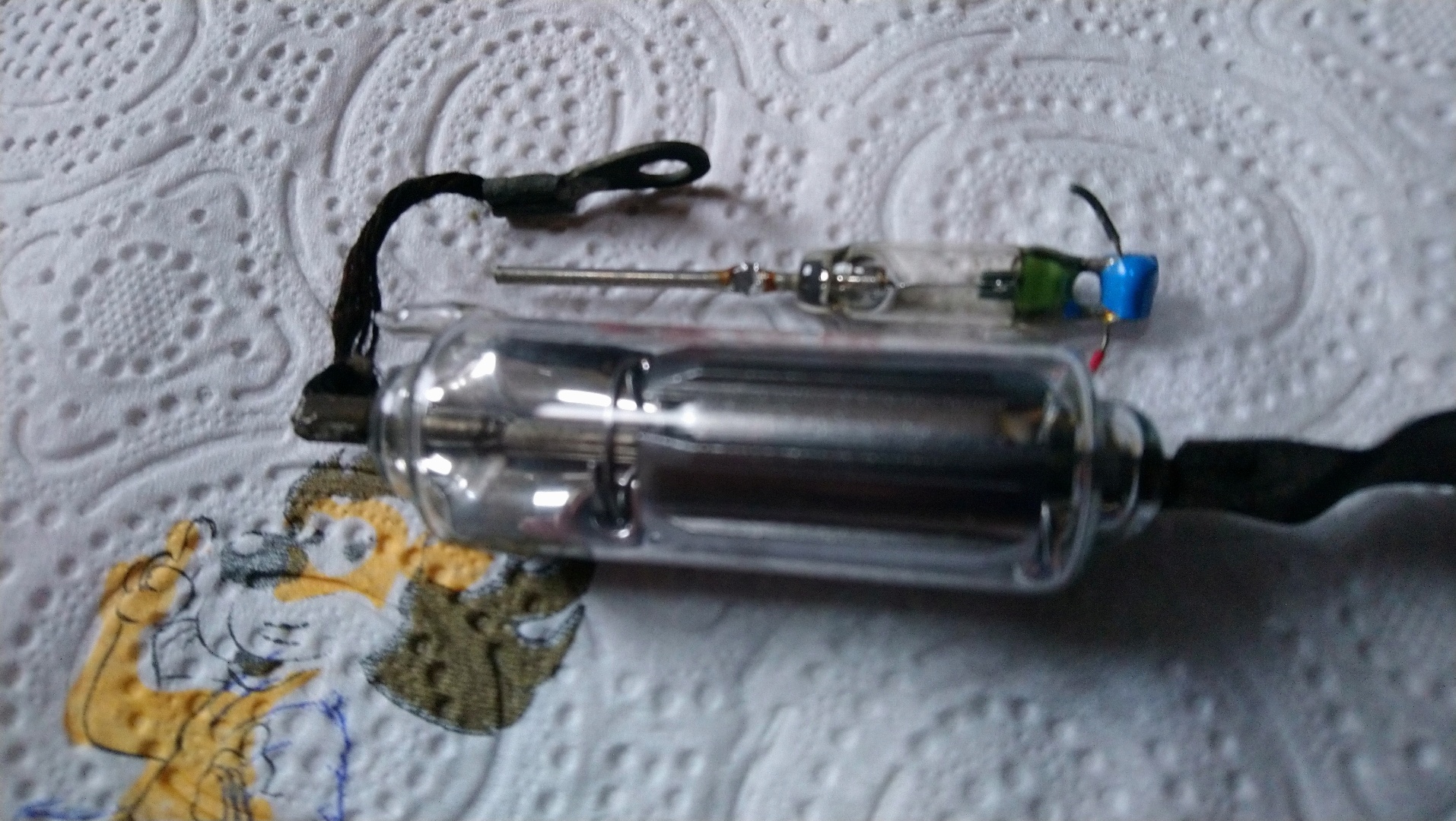 Viszont ha megnézed a vezető azon részét, ami átmegy az üvegen, az kifejezetten vastagabb, mint ami a csőben látható. Sajnos a felső rész nem látható jól, de az alsó az biztosan nem mozog és mereven tartja az egész részt. Megpróbálhatsz egy 330 - 680k ellenállás közbeiktatásával 230V -ot adni rá. Ha vibrál akkor valami kisülési cső. Ha durran, akkor nem az volt ...