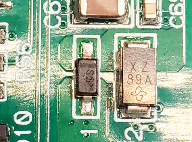 A mellékletben látható két dióda azonosításában kérnék segítséget. A bal oldali elvileg normál vagy schottky dióda, a jobb oldali pedig TVS. Utóbbi zárlatos lett és vitte magával előbbit is az örök elektronmezőkre.