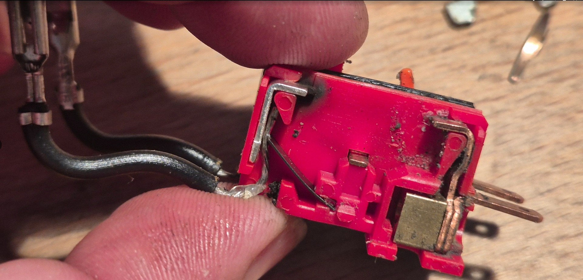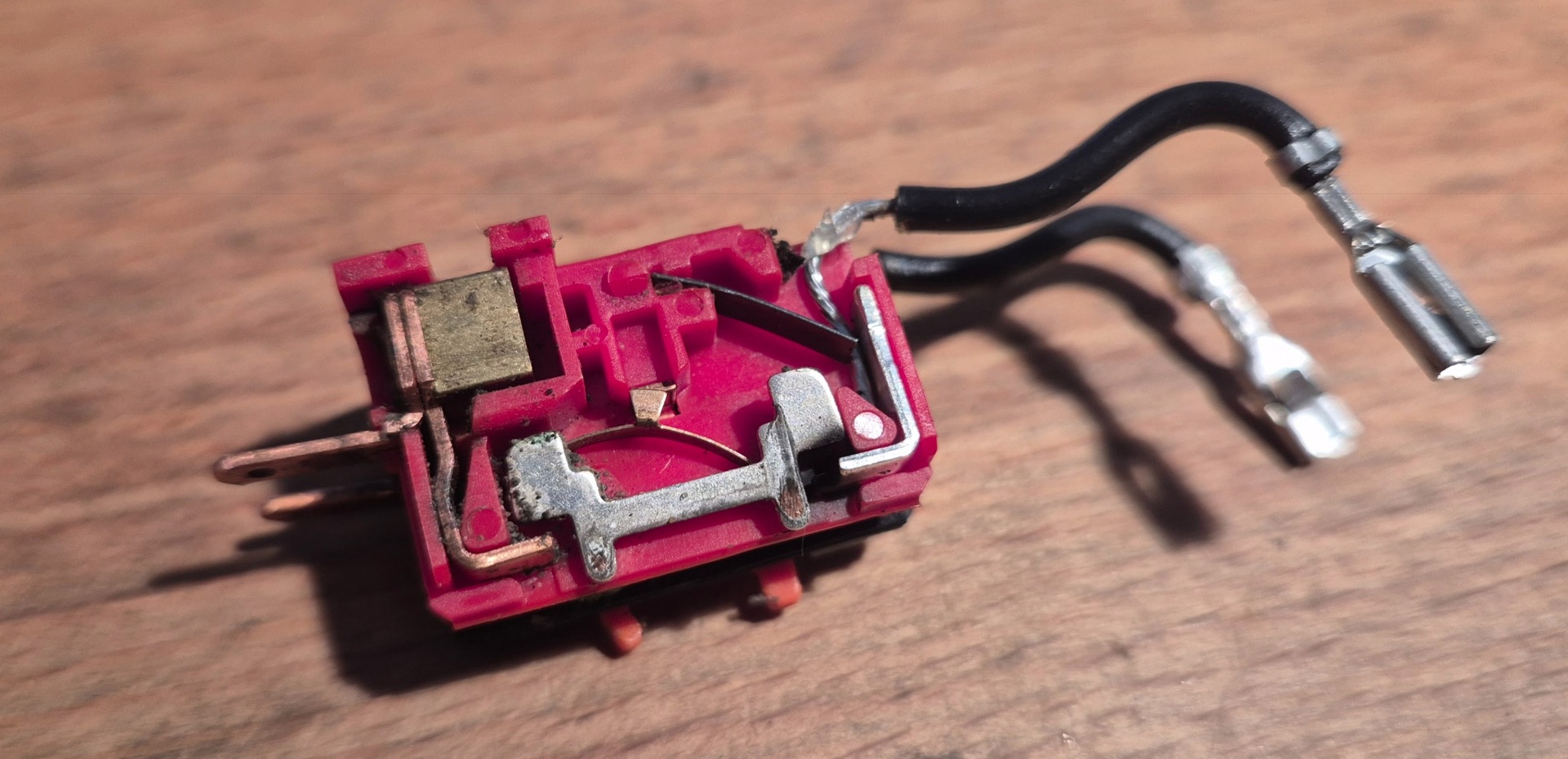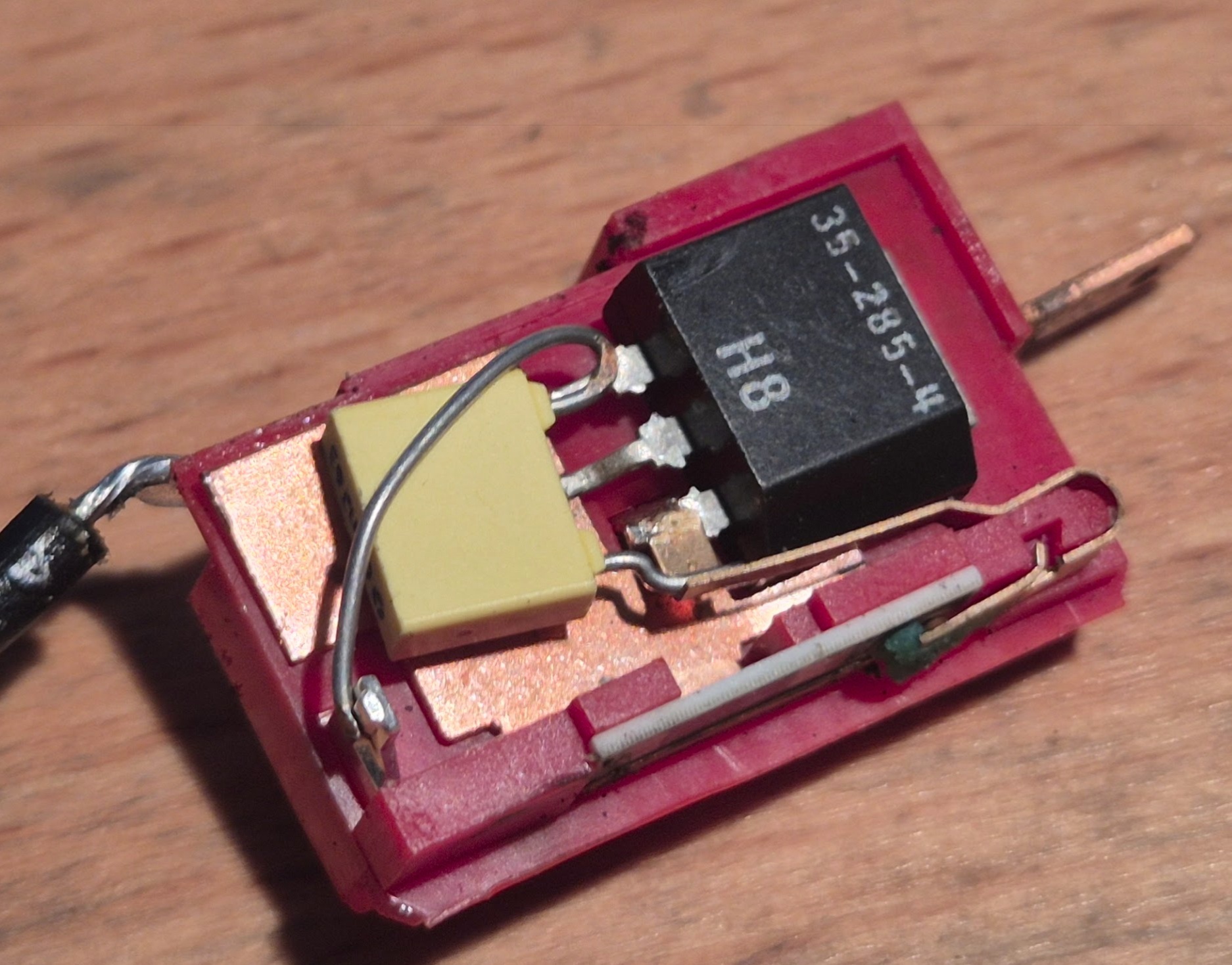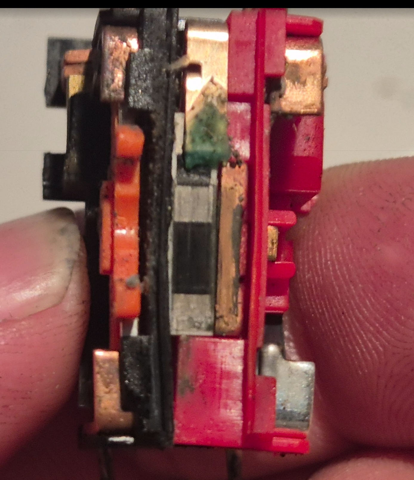 Elektronikai alkatrész más nincs, csak ennyi, az összes többi rész az lényegében mechanika. Csatoltam még három képet. Az egyiken látszik a piros rész túloldala. Ez van összepasszintva egy fekete résszel (amin szintén némi mechanika van), a tetején pedig ilyen csúszó potméter, ami a hajlított réz csatlakozóval a triac (?) jobb szélső lábához csatlakozik.