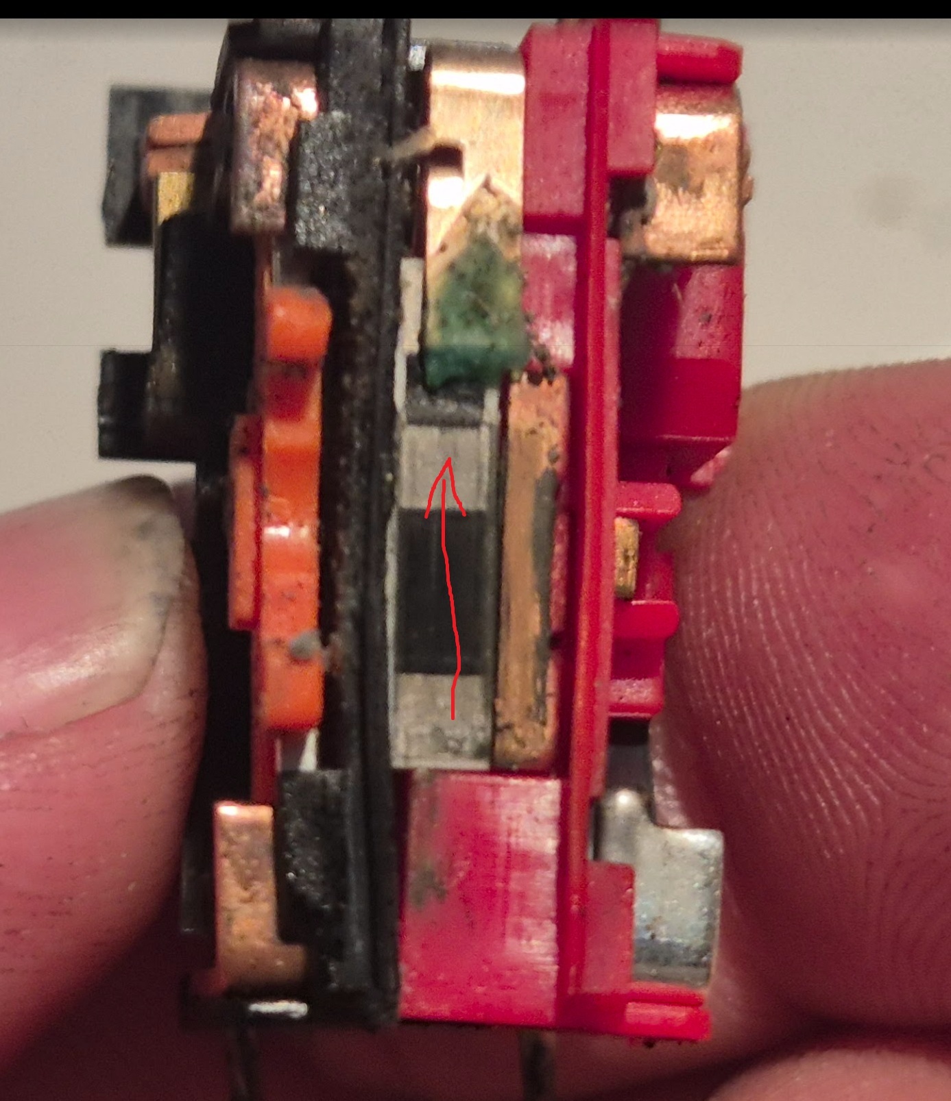 Nem szedtem még teljesen atomjaira, de nincs más benne, csak amit az eddigi képeken mutattam. Az egész cucc kb akkora, mint két kockacukor. Ez még belemegy egy foglalatba, aminek a belében van egy érintkező, az csúszkál a potméteren (ld. kép). Mondjuk azt még nem berheltem ki belőle, lehet, hogy ott még érhet némi meglepetés, de nem hiszem...