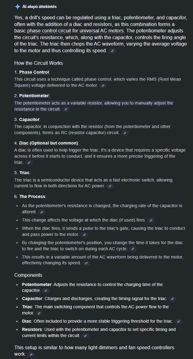 https://www.aliexpress.com/w/wholesale-drill-speed-control-switch.h...A8N7sB Én ilyesmit https://www.aliexpress.com/item/1005009422835430.html sikerrel bebarkácsoltam a , fúrómba, dekopírfűrészembe. De sajnos sikerült már gagyit is vennem, amiben csak egy dióda van, félhullámos egyenrángatás, fele teljesítmény...