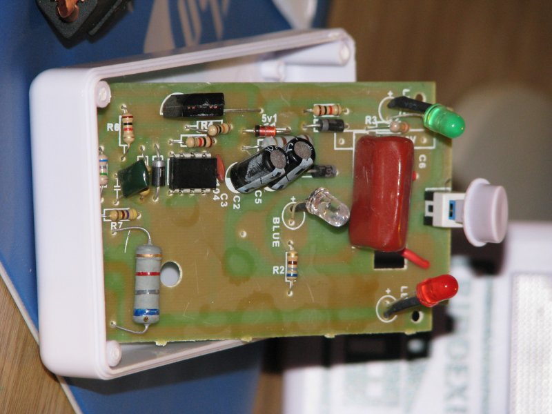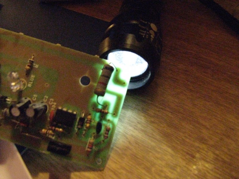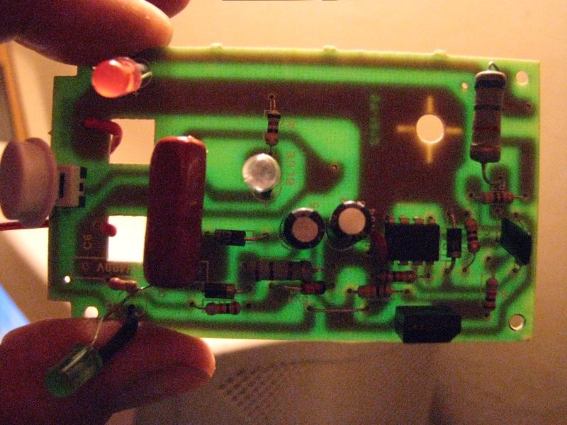 Ne bírtam tovább és szétszedtem. Egy kék led van a készülék közepén az ablak mögött. Mint az alábbi fotókon látható lesz a kék led egy ellenálláson keresztül a fázisra vagy a nullára csatlakozik attól függően, hogy dugjuk a konnektorba. A led másik lába a nyák bal szélén a kapcsolóra csatlakozik a kapcsoló másik lába pedig a panel alsó szélén egy átkötésig halad majd csatlakozik arra a fóliára amire a led ellenállása van kötve. A kigyó megharapta a farkát. A nyolc lábú ic szerepe is tisztázatlan mert az 1-es 8-as lába is erre a pontra van kötve.A 2, 6, 7, láb nincs beforrasztva. Érdekes még a jobb felső sarokban a 2 wattos ellenállás szerepe mivel a felső lába nem vezet sehova. Mind ez 2500.- Ft