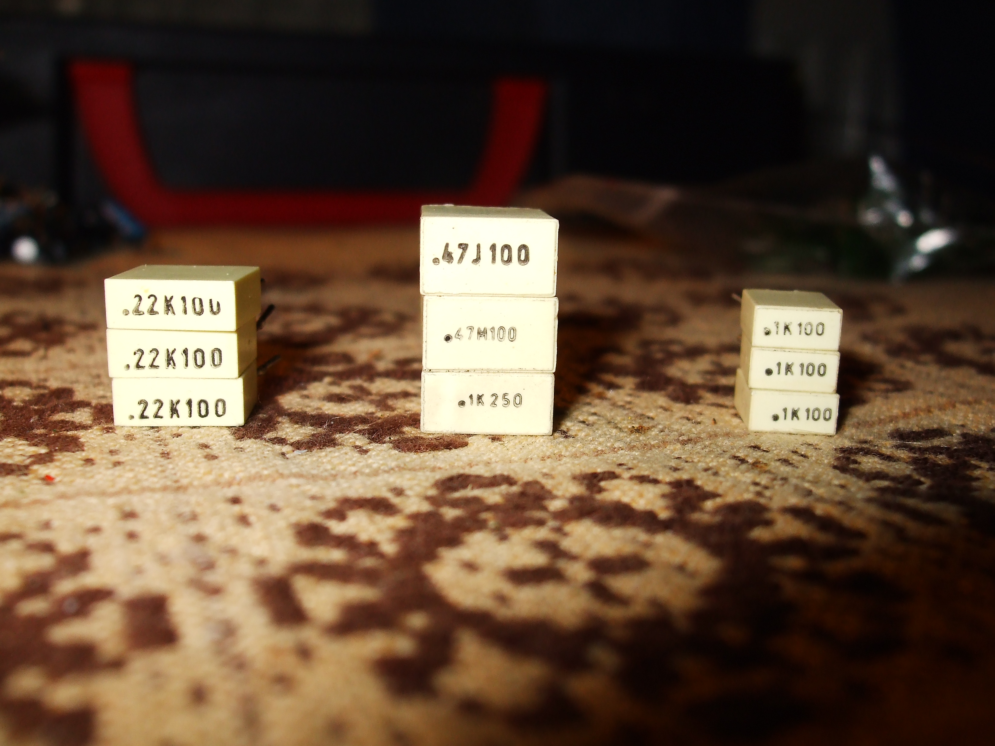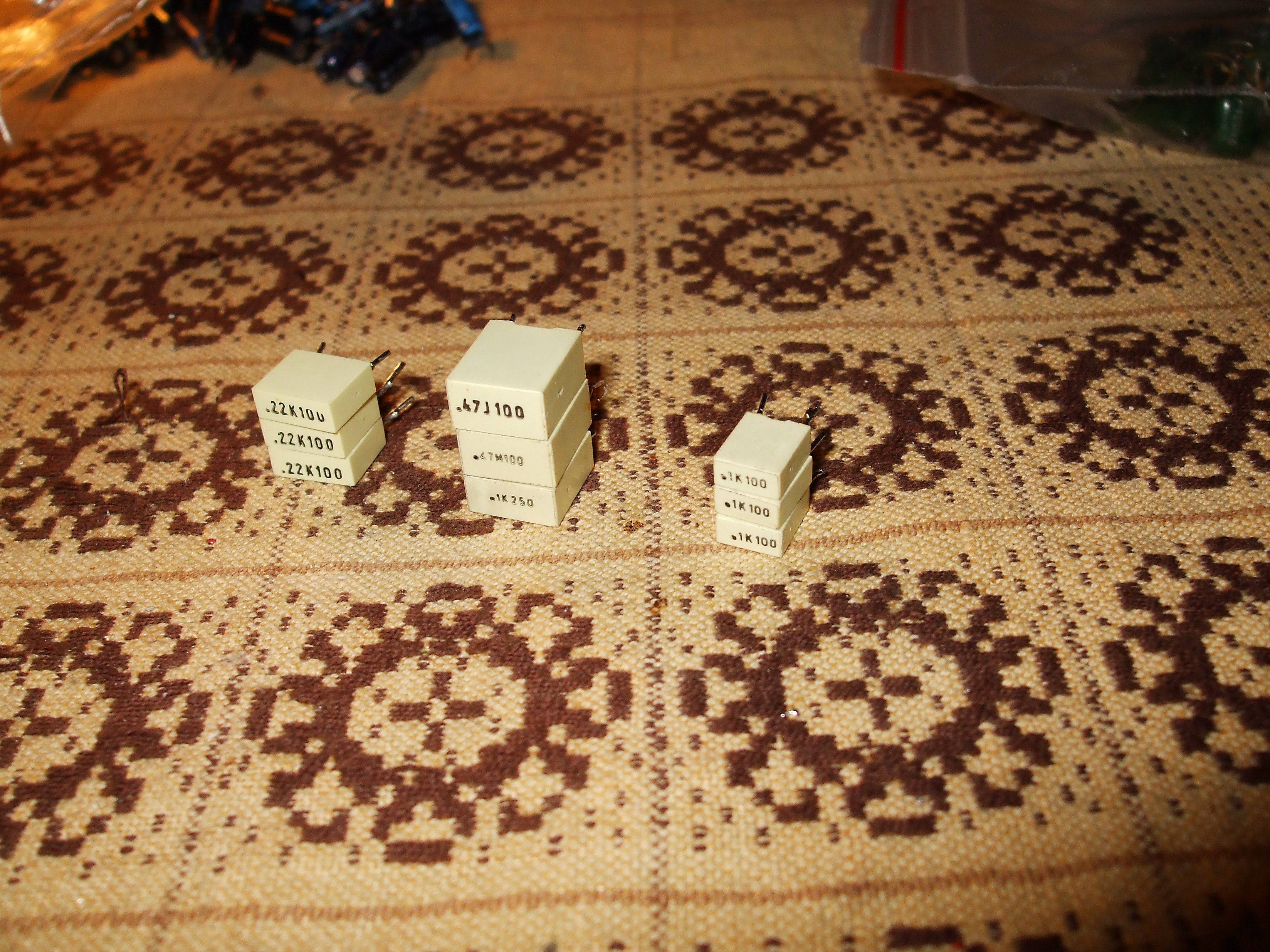 A nagy fehér kondikon rajta vannak az értékek...típusuk: MKP (műanyag dielektrikumú fóliakondenzátor) A kis fehéres-vajszínű téglatest alakúak pedig sorban 0,22 uF; 0,47 uF; 0,1 µF értékűek és 100 voltosak, kivéve a középső oszlop legalsó tagját, az 250 voltot visel el maximálisan.