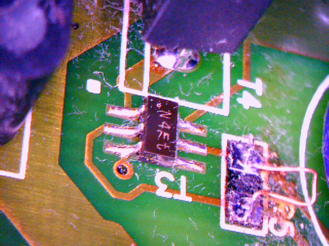 A tranzisztor lenne az én tippem is, csak nem ismerem annyira ezeket az SMD alkatrészeket, hogy hogyan is érdemes a keresésüknek nekiindulni. Nem három lába van, s hogy látszódjon is, teszek ide másik képet a testvéréről. Egy P csatornás MOSFET-et hajt meg, vagyis inkább hajtott. E mellett volt egy "0" jelzésű ellenállás, ami szakadást mutatott a panelen, de meg is volt barnulva, mint ahogy alatta a panel is.