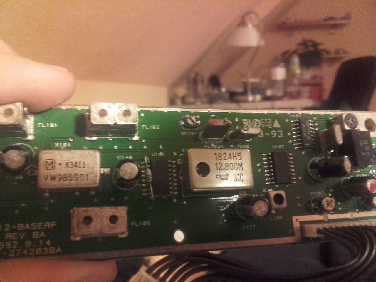Valószínuleg az egy VCO /voltage controlled oscilator/ és az árnyékoló doboz nyílásán keresztul egy megfelelo szerszámmal pld. csavarhúzóval lehet a beépített trimerkondenzátorral korrigálni a 12,800 MHz-es frekvenciáját.