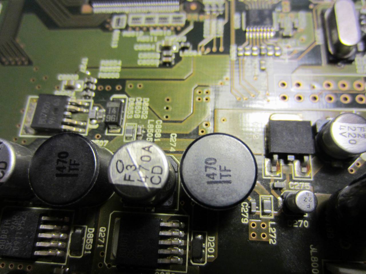 Szerintem középen mind a három 470 mikro. Azt, hogy hány V-os, a környezete segíthet eldönteni. Viszont szinte biztosan kapcsi táphoz tartozik, ezért sima elko nem jó oda, csak low esr típusú. Ha elfér lehet hagyományos tokozású is, nem csak smd.