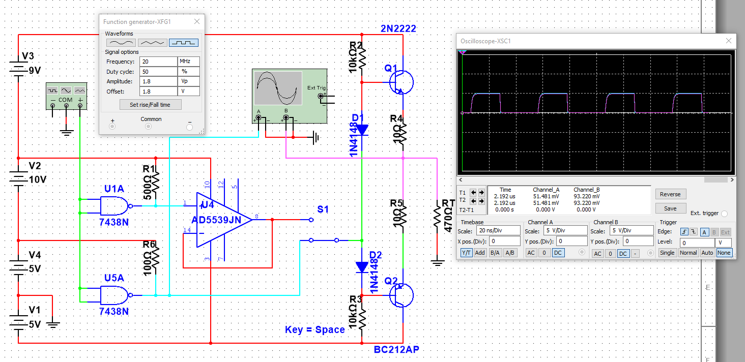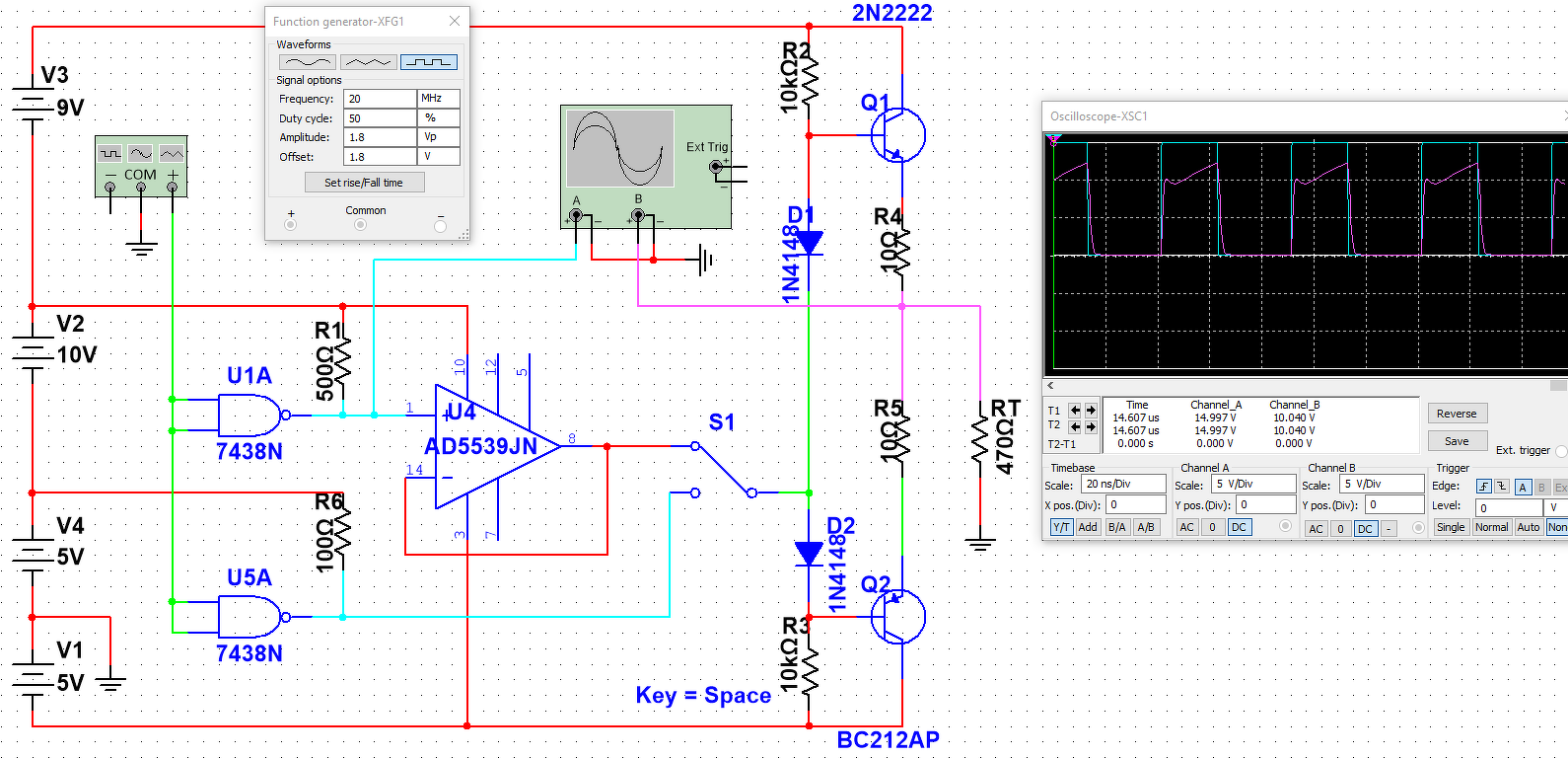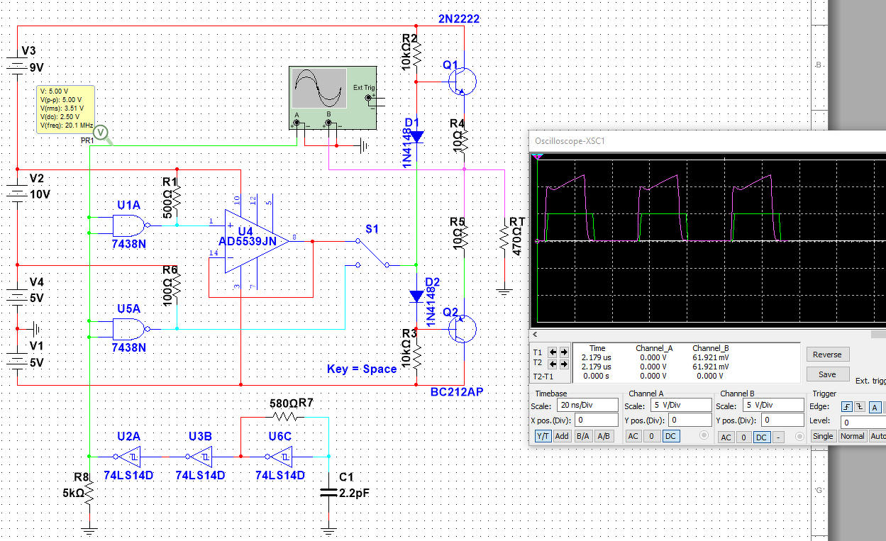 Kipróbáltam a javasolt IC-ket, meg még másik hármat. Legjobban az 5539 jött be; ez van a boltban is, meg a fiókban is... Az OC TTL IC 74LS07 lesz a gyakorlatban, de a szimulátor könyvtárában található 7438-al elfogadhatóan működik 20 MHz-ig is. Talán kár erőlködni a MAX038-al, mert 20 MHz elérhető (elvben) 74LS14 inverter oszcillátorral is, aminek egészen más a beszerezhetősége, meg az ára. Nyilván a stabilitása is... Köszönöm mégegyszer! Jó éjt!